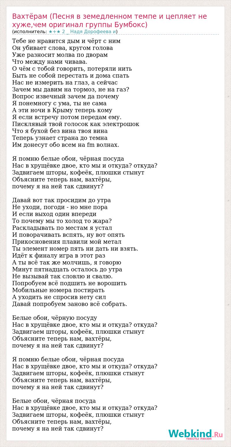 Главная→Исполнители→★+★ 2 _ Надя Дорофеева и→Вахтёрам (Песня в земедленном темпе и цепляет не хуже,чем оригинал группы Бумбок