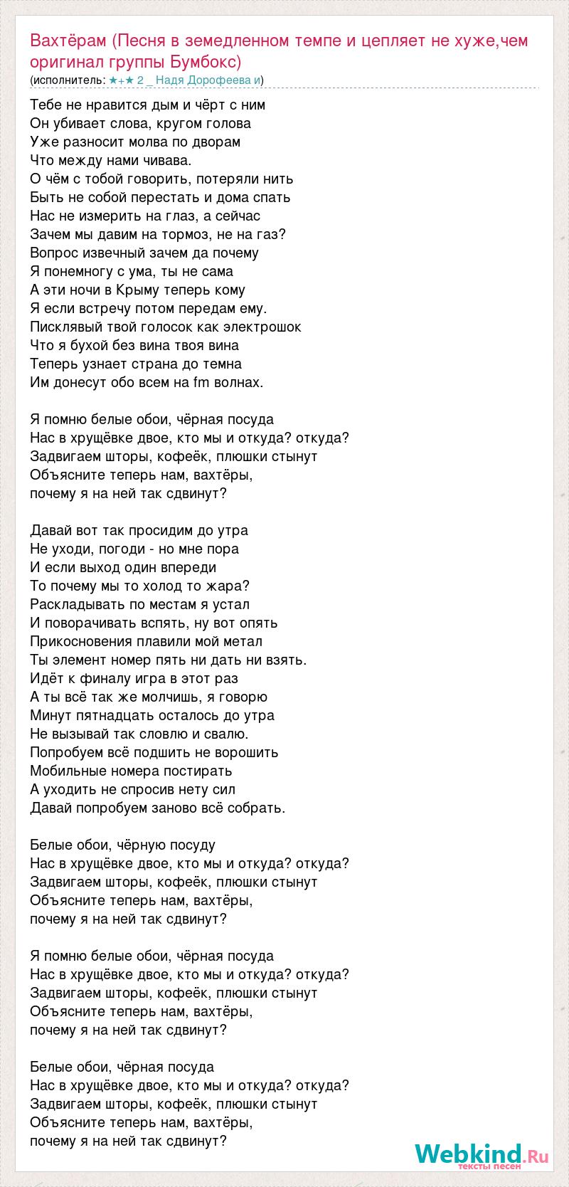 Главная→Исполнители→★+★ 2 _ Надя Дорофеева и→Вахтёрам (Песня в земедленном темпе и цепляет не хуже,чем оригинал группы Бумбок