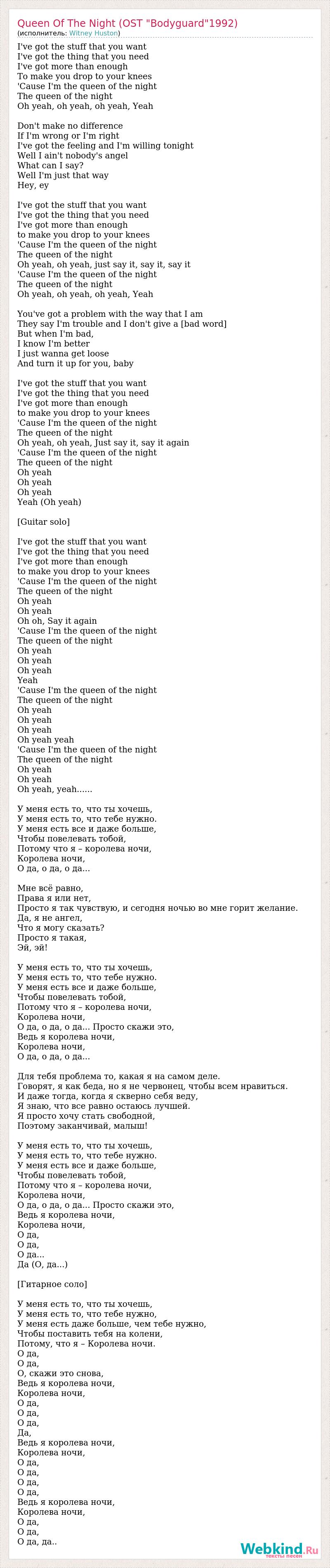 I've got the stuff that you want I've got the thing that you need I've got more than enough To make you drop to your knees 'Cause I'm the queen of the night The queen of the night Oh yeah, oh yeah, oh yeah, Yeah Don't make no difference If I'm wrong or I'm right I've got the feeling and I'm willing tonight Well I ain't nobody's angel What can I say? Well I'm just that way Hey, ey I've got the stuff that you want I've got the thing that you need I've got more than enough to make you drop to your knees 'Cause I'm the queen of the night The queen of the night Oh yeah, oh yeah, just say it, say it, say it 'Cause I'm the queen of the night The queen of the night Oh yeah, oh yeah, oh yeah, Yeah You've got a problem with the way that I am They say I'm trouble and I don't give a [bad word] But when I'm bad, I know I'm better I just wanna get loose And turn it up for you, baby I've got the stuff that you want I've got the thing that you need I've got more than enough to make you drop to your knees 'Cause I'm the queen of the night The queen of the night Oh yeah, oh yeah, Just say it, say it again 'Cause I'm the queen of the night The queen of the night Oh yeah Oh yeah Oh yeah Yeah (Oh yeah) [Guitar solo] I've got the stuff that you want I've got the thing that you need I've got more than enough to make you drop to your knees 'Cause I'm the queen of the night The queen of the night Oh yeah Oh yeah Oh oh, Say it again 'Cause I'm the queen of the night The queen of the night Oh yeah Oh yeah Oh yeah Yeah 'Cause I'm the queen of the night The queen of the night Oh yeah Oh yeah Oh yeah Oh yeah yeah 'Cause I'm the queen of the night The queen of the night Oh yeah Oh yeah Oh yeah, yeah...... У меня есть то, что ты хочешь, У меня есть то, что тебе нужно. У меня есть все и даже больше, Чтобы повелевать тобой, Потому что я – королева ночи, Королева ночи, О да, о да, о да... Мне всё равно, Права я или нет, Просто я так чувствую, и сегодня ночью во мне горит желание. Да, я не ангел, Что я могу сказать? Просто я такая, Эй, эй! У меня есть то, что ты хочешь, У меня есть то, что тебе нужно. У меня есть все и даже больше, Чтобы повелевать тобой, Потому что я – королева ночи, Королева ночи, О да, о да, о да... Просто скажи это, Ведь я королева ночи, Королева ночи, О да, о да, о да... Для тебя проблема то, какая я на самом деле. Говорят, я как беда, но я не червонец, чтобы всем нравиться. И даже тогда, когда я скверно себя веду, Я знаю, что все равно остаюсь лучшей. Я просто хочу стать свободной, Поэтому заканчивай, малыш! У меня есть то, что ты хочешь, У меня есть то, что тебе нужно. У меня есть все и даже больше, Чтобы повелевать тобой, Потому что я – королева ночи, Королева ночи, О да, о да, о да... Просто скажи это, Ведь я королева ночи, Королева ночи, О да, О да, О да... Да (О, да...) [Гитарное соло] У меня есть то, что ты хочешь, У меня есть то, что тебе нужно, У меня есть даже больше, чем тебе нужно, Чтобы поставить тебя на колени, Потому, что я – Королева ночи. О да, О да, О, скажи это снова, Ведь я королева ночи, Королева ночи, О да, О да, О да, Да, Ведь я королева ночи, Королева ночи, О да, О да, О да, О да, Ведь я королева ночи, Королева ночи, О да, О да, О да, да..