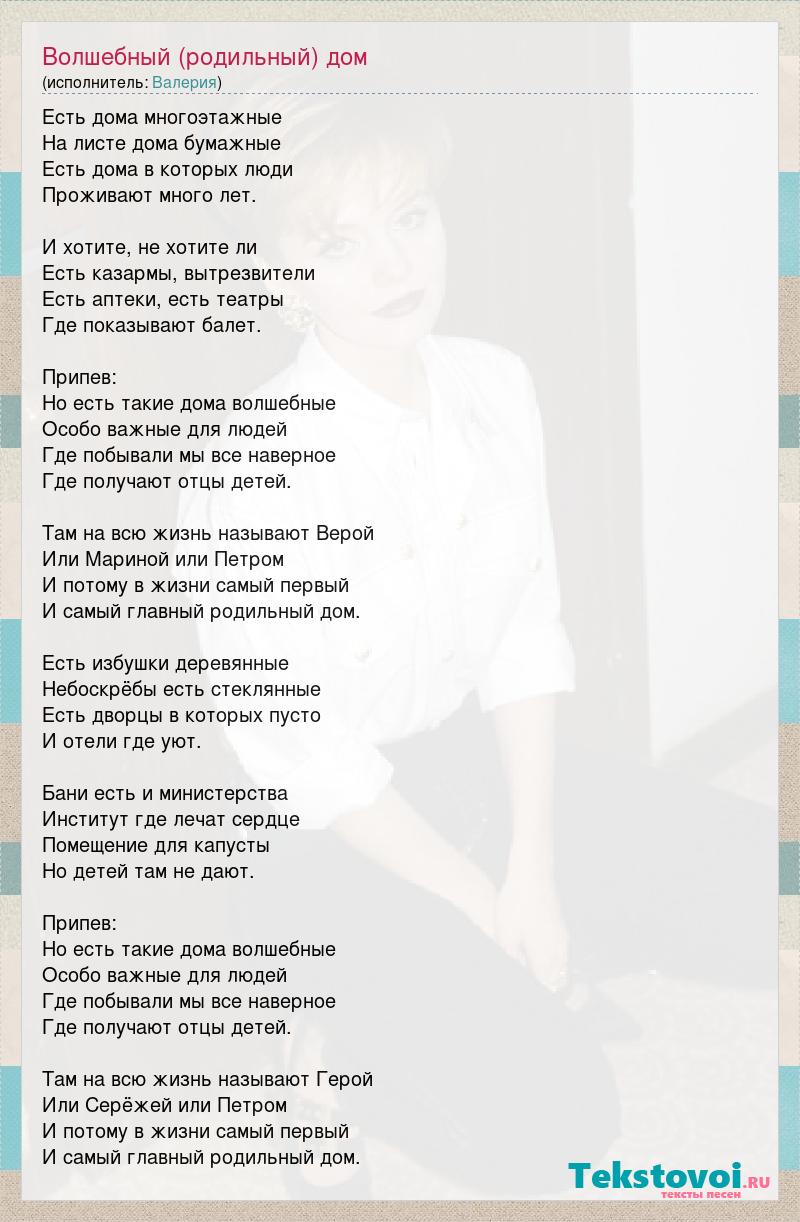 Есть дома многоэтажные На листе дома бумажные Есть дома в которых люди Проживают много лет. И хотите, не хотите ли Есть казармы, вытрезвители Есть аптеки, есть театры Где показывают балет. Припев: Но есть такие дома волшебные Особо важные для людей Где побывали мы все наверное Где получают отцы детей. Там на всю жизнь называют Верой Или Мариной или Петром И потому в жизни самый первый И самый главный родильный дом. Есть избушки деревянные Небоскрёбы есть стеклянные Есть дворцы в которых пусто И отели где уют. Бани есть и министерства Институт где лечат сердце Помещение для капусты Но детей там не дают. Припев: Но есть такие дома волшебные Особо важные для людей Где побывали мы все наверное Где получают отцы детей. Там на всю жизнь называют Герой Или Серёжей или Петром И потому в жизни самый первый И самый главный родильный дом.