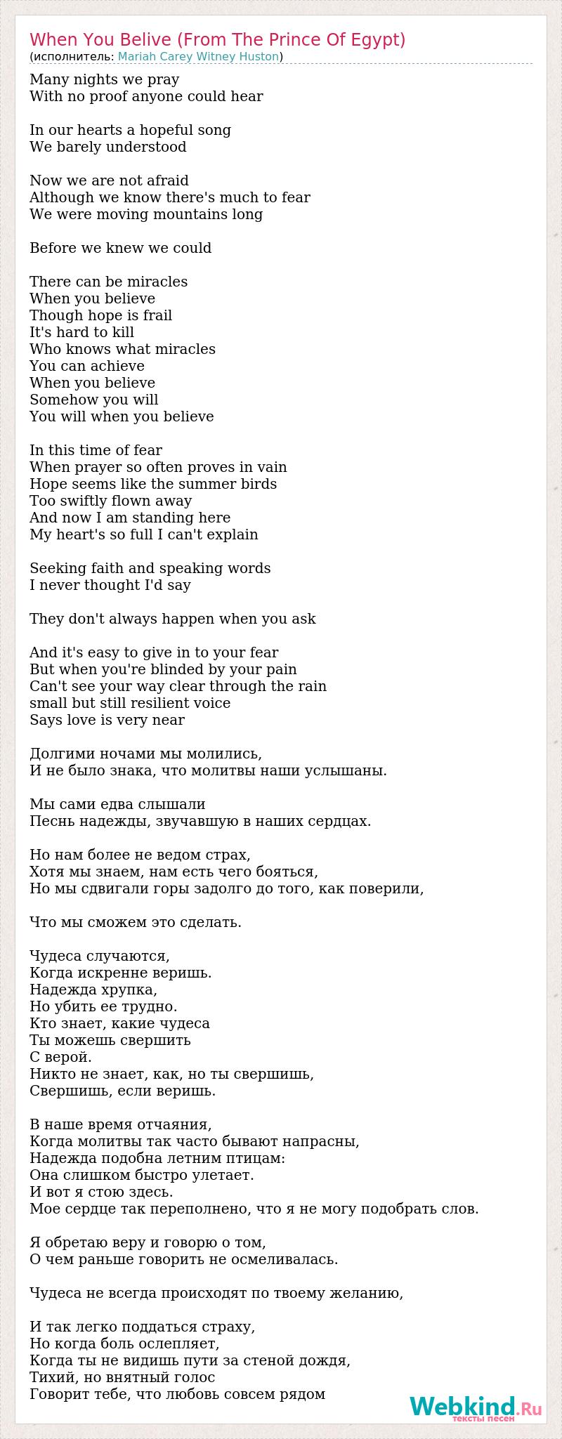 Many nights we pray With no proof anyone could hear In our hearts a hopeful song We barely understood Now we are not afraid Although we know there's much to fear We were moving mountains long Before we knew we could There can be miracles When you believe Though hope is frail It's hard to kill Who knows what miracles You can achieve When you believe Somehow you will You will when you believe In this time of fear When prayer so often proves in vain Hope seems like the summer birds Too swiftly flown away And now I am standing here My heart's so full I can't explain Seeking faith and speaking words I never thought I'd say They don't always happen when you ask And it's easy to give in to your fear But when you're blinded by your pain Can't see your way clear through the rain small but still resilient voice Says love is very near Долгими ночами мы молились, И не было знака, что молитвы наши услышаны. Мы сами едва слышали Песнь надежды, звучавшую в наших сердцах. Но нам более не ведом страх, Хотя мы знаем, нам есть чего бояться, Но мы сдвигали горы задолго до того, как поверили, Что мы сможем это сделать. Чудеса случаются, Когда искренне веришь. Надежда хрупка, Но убить ее трудно. Кто знает, какие чудеса Ты можешь свершить С верой. Никто не знает, как, но ты свершишь, Свершишь, если веришь. В наше время отчаяния, Когда молитвы так часто бывают напрасны, Надежда подобна летним птицам: Она слишком быстро улетает. И вот я стою здесь. Мое сердце так переполнено, что я не могу подобрать слов. Я обретаю веру и говорю о том, О чем раньше говорить не осмеливалась. Чудеса не всегда происходят по твоему желанию, И так легко поддаться страху, Но когда боль ослепляет, Когда ты не видишь пути за стеной дождя, Тихий, но внятный голос Говорит тебе, что любовь совсем рядом