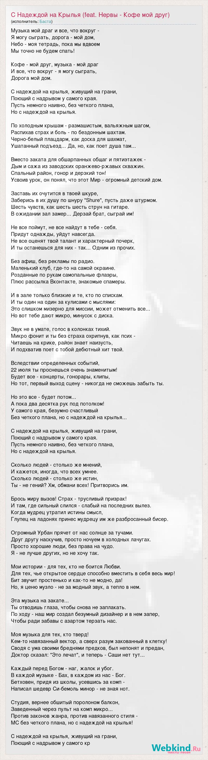 Музыка мой драг и все, что вокруг - Я могу сыграть, дорога - мой дом, Небо - моя тетрадь, пока мы вдвоем Мы точно не будем спать! Кофе - мой друг, музыка - мой драг И все, что вокруг - я могу сыграть, Дорога мой дом. С надеждой на крылья, живущий на грани, Поющий с надрывом у самого края. Пусть немного наивно, без четкого плана, Но с надеждой на крылья. По холодным крышам - размашистым, вальяжным шагом, Распихав страх и боль - по бездонным шахтам. Черно-белый плацдарм, как доска для шахмат, Ушатанный подъезд... Да, но, как поет душа там... Вместо заката для обшарпанных общаг и пятиэтажек - Дым и сажа из заводских оранжево-ржавых скважин. Спальный район, гонор и дерзкий тон! Усвоив урок, он понял, что этот Мир - огромный детский дом. Заставь их очутится в твоей шкуре, Заберись в их душу по шнуру "Shure", пусть даже штурмом. Шесть чувств, как шесть шесть струн на гитаре. В ожидании зал замер... Дерзай брат, сыграй им! Не все поймут, не все найдут в тебе - себя. Придут однажды, уйдут навсегда. Не все оценят твой талант и характерный почерк, И ты останешься для них - так... Одним из прочих. Без афиш, без рекламы по радио. Маленький клуб, где-то на самой окраине. Розданные по рукам самопальные флаэры, Плюс рассылка Вконтакте, знакомые спамеры. И в зале только близкие и те, кто по спискам. И ты один на один за кулисами с мыслями: Это слишком мизерно для миссии, может отменить все... Но вот тебе дают микро, минусок с диска. Звук не в умате, голос в колонках тихий. Микро фонит и ты без страха охрипнув, как псих - Читаешь на крике, район знает наизусть, И подхватив поет с тобой дебютный хит твой. Вследствии определенных событий, 22 июля ты проснешься очень знаменитым! Будет все - концерты, гонорары, клипы, Но тот, первый выход сцену - никогда не сможешь забыть ты. Но это все - будет потом... А пока два десятка рук под потолком! У самого края, безумно счастливый Без четкого плана, но с надеждой на крылья... С надеждой на крылья, живущий на грани, Поющий с надрывом у самого края. Пусть немного наивно, без четкого плана, Но с надеждой на крылья. Сколько людей - столько же мнений, И кажется, иногда, что всех умнее. Сколько людей - столько же истин, Ты - не гений? Хм, обмани всех! Притворись им. Брось миру вызов! Страх - трусливый призрак! И там, где сильный слился - слабый на последних вылез. Когда мудрец утратил истины смысл, Глупец на ладонях принес мудрецу им же разбросанный бисер. Огромный Урбан прячет от нас солнце за тучами. Друг другу наскучив, просто ночуем в холодных лачугах. Просто хорошие люди, без права на чудо. Я - не лучше других, но не хочу так. Мои истории - для тех, кто не боится Любви. Для тех, чье открытое сердце способно вместить в себя весь мир! Бит звучит простенько и как-то не модно, да! Но, я ценю музло - не за модный звук, а тепло в нем. Эта музыка на закате... Ты отводишь глаза, чтобы снова не заплакать. По ходу - наш мир создал безумный дизайнер и в нем запер, Чтобы ради забавы с азартом терзать нас. Моя музыка для тех, кто тверд! Кем-то навязанный вектор, а сверх разум закованный в клетку! Сводя с ума своими бреднями предков, был непонят и предан, Доктор сказал: "Это лечат", и теперь - Саши нет тут... Каждый перед Богом - наг, жалок и убог. В каждой музыке - Бах, в каждом из нас - Бог. Бетховен, придя из школы, усевшись за комп - Написал шедевр Си-бемоль минор - не зная нот. Студия, вернее обшитый поролоном балкон, Заведен