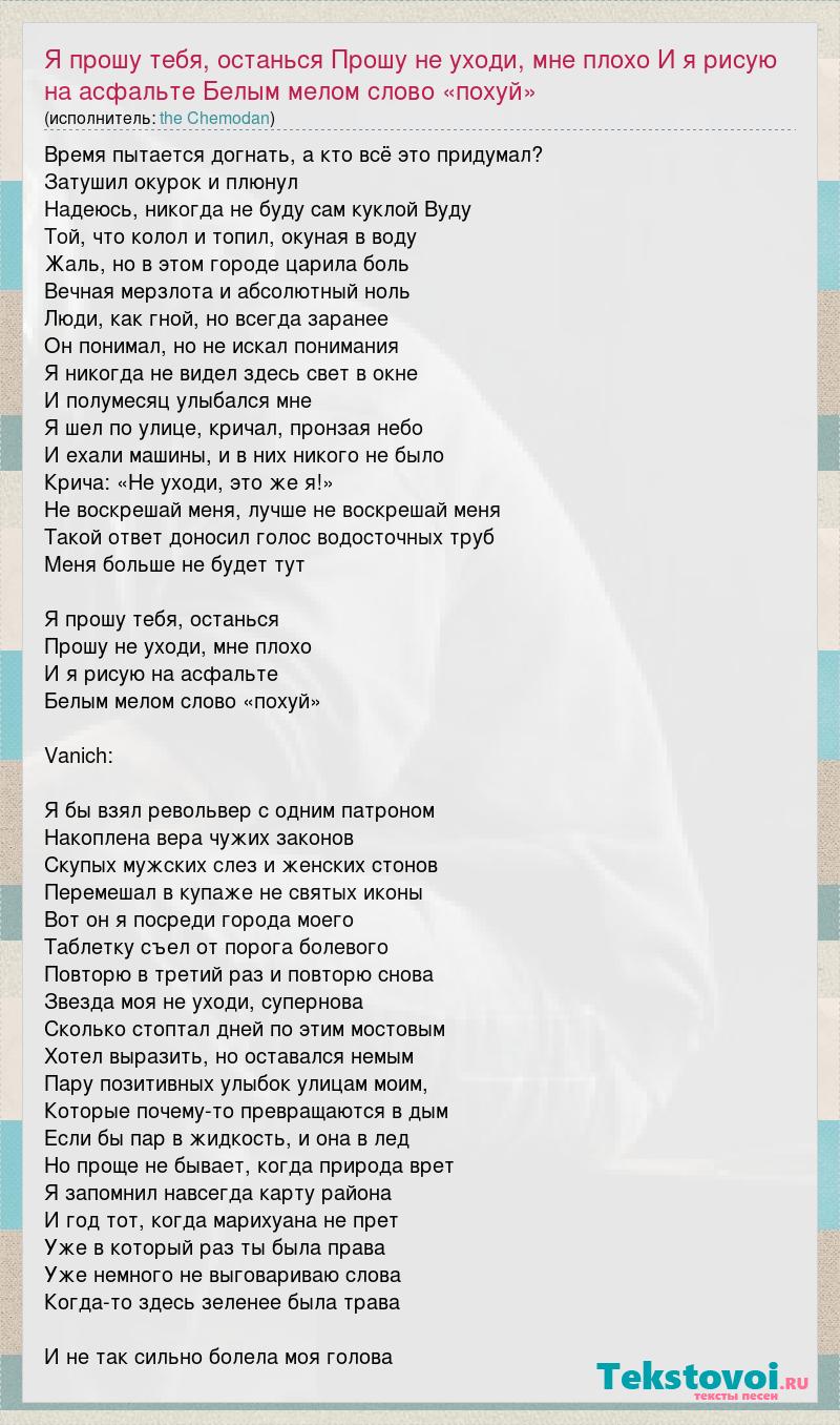 Главная→Исполнители→the Chemodan→Я прошу тебя, останься Прошу не уходи, мне плохо И я рисую на асфальте Белы