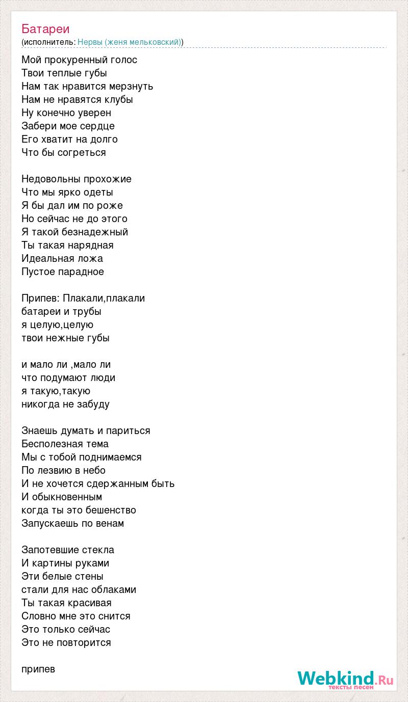 Мой прокуренный голос Твои теплые губы Нам так нравится мерзнуть Нам не нравятся клубы Ну конечно уверен Забери мое сердце Его хватит на долго Что бы согреться Недовольны прохожие Что мы ярко одеты Я бы дал им по роже Но сейчас не до этого Я такой безнадежный Ты такая нарядная Идеальная ложа Пустое парадное Припев: Плакали,плакали батареи и трубы я целую,целую твои нежные губы и мало ли ,мало ли что подумают люди я такую,такую никогда не забуду Знаешь думать и париться Бесполезная тема Мы с тобой поднимаемся По лезвию в небо И не хочется сдержанным быть И обыкновенным когда ты это бешенство Запускаешь по венам Запотевшие стекла И картины руками Эти белые стены стали для нас облаками Ты такая красивая Словно мне это снится Это только сейчас Это не повторится припев