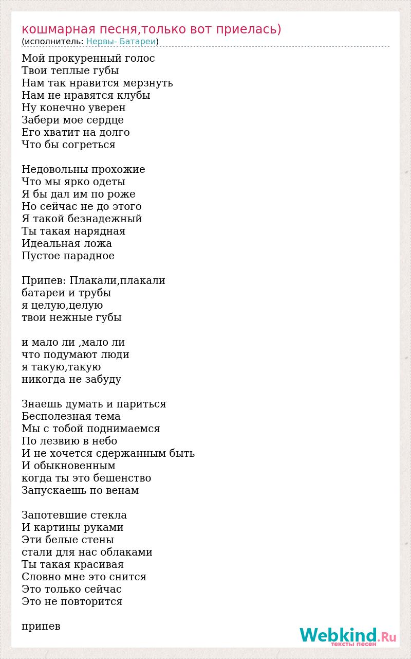 Мой прокуренный голос Твои теплые губы Нам так нравится мерзнуть Нам не нравятся клубы Ну конечно уверен Забери мое сердце Его хватит на долго Что бы согреться Недовольны прохожие Что мы ярко одеты Я бы дал им по роже Но сейчас не до этого Я такой безнадежный Ты такая нарядная Идеальная ложа Пустое парадное Припев: Плакали,плакали батареи и трубы я целую,целую твои нежные губы и мало ли ,мало ли что подумают люди я такую,такую никогда не забуду Знаешь думать и париться Бесполезная тема Мы с тобой поднимаемся По лезвию в небо И не хочется сдержанным быть И обыкновенным когда ты это бешенство Запускаешь по венам Запотевшие стекла И картины руками Эти белые стены стали для нас облаками Ты такая красивая Словно мне это снится Это только сейчас Это не повторится припев