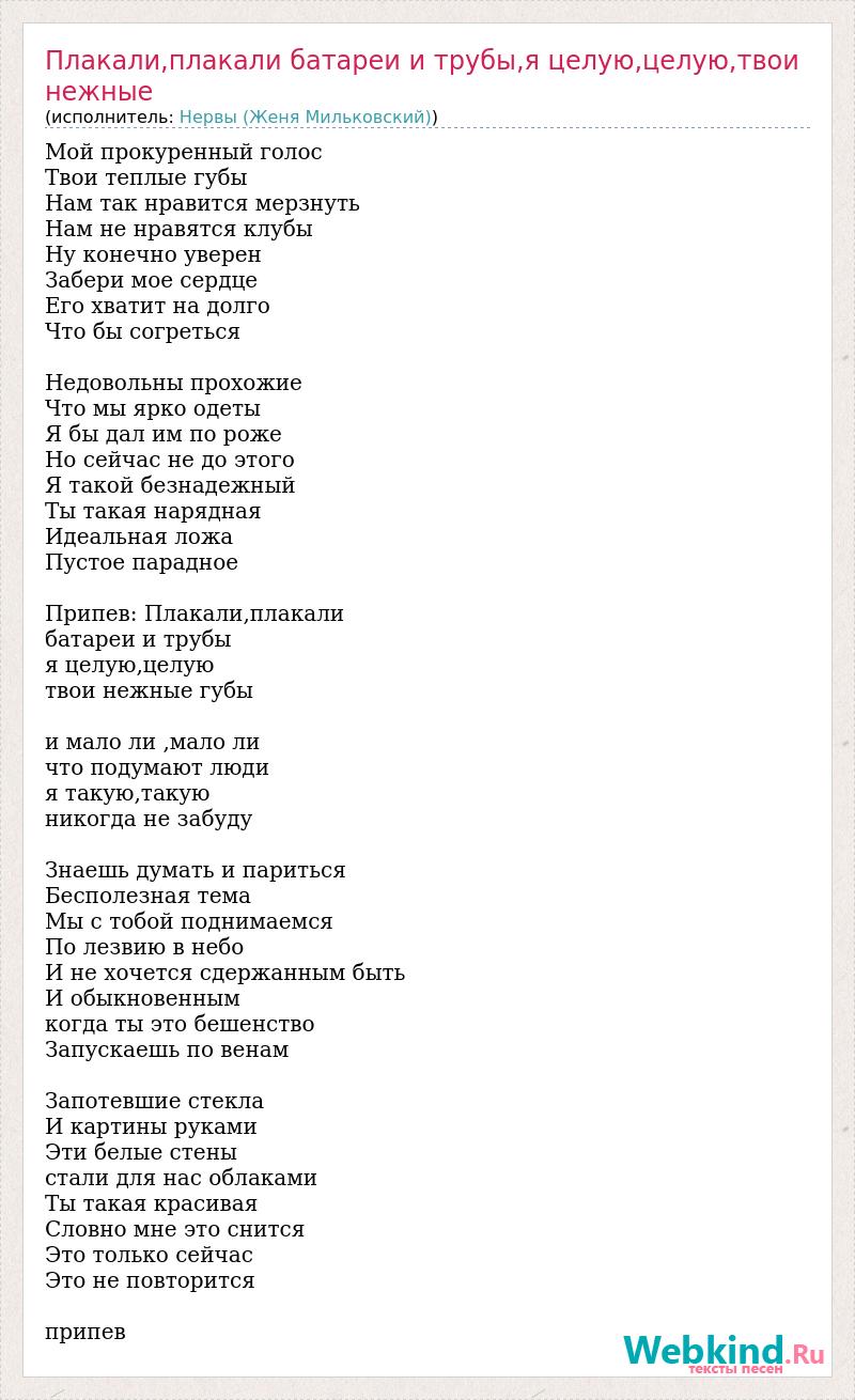 Мой прокуренный голос Твои теплые губы Нам так нравится мерзнуть Нам не нравятся клубы Ну конечно уверен Забери мое сердце Его хватит на долго Что бы согреться Недовольны прохожие Что мы ярко одеты Я бы дал им по роже Но сейчас не до этого Я такой безнадежный Ты такая нарядная Идеальная ложа Пустое парадное Припев: Плакали,плакали батареи и трубы я целую,целую твои нежные губы и мало ли ,мало ли что подумают люди я такую,такую никогда не забуду Знаешь думать и париться Бесполезная тема Мы с тобой поднимаемся По лезвию в небо И не хочется сдержанным быть И обыкновенным когда ты это бешенство Запускаешь по венам Запотевшие стекла И картины руками Эти белые стены стали для нас облаками Ты такая красивая Словно мне это снится Это только сейчас Это не повторится припев