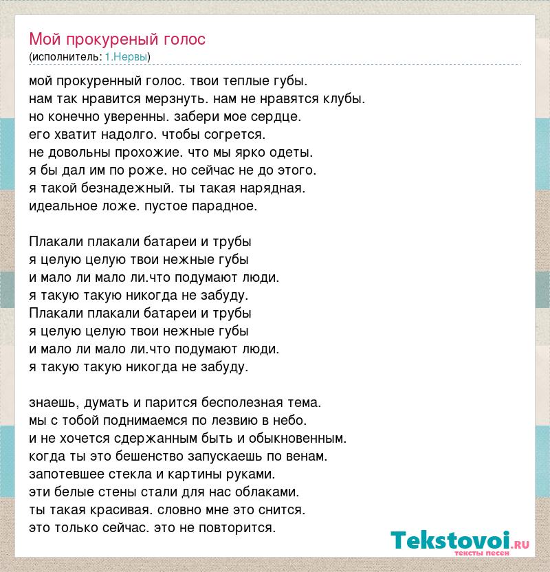 мой прокуренный голос. твои теплые губы. нам так нравится мерзнуть. нам не нравятся клубы. но конечно уверенны. забери мое сердце. его хватит надолго. чтобы согрется. не довольны прохожие. что мы ярко одеты. я бы дал им по роже. но сейчас не до этого. я такой безнадежный. ты такая нарядная. идеальное ложе. пустое парадное. Плакали плакали батареи и трубы я целую целую твои нежные губы и мало ли мало ли.что подумают люди. я такую такую никогда не забуду. Плакали плакали батареи и трубы я целую целую твои нежные губы и мало ли мало ли.что подумают люди. я такую такую никогда не забуду. знаешь, думать и парится бесполезная тема. мы с тобой поднимаемся по лезвию в небо. и не хочется сдержанным быть и обыкновенным. когда ты это бешенство запускаешь по венам. запотевшее стекла и картины руками. эти белые стены стали для нас облаками. ты такая красивая. словно мне это снится. это только сейчас. это не повторится.