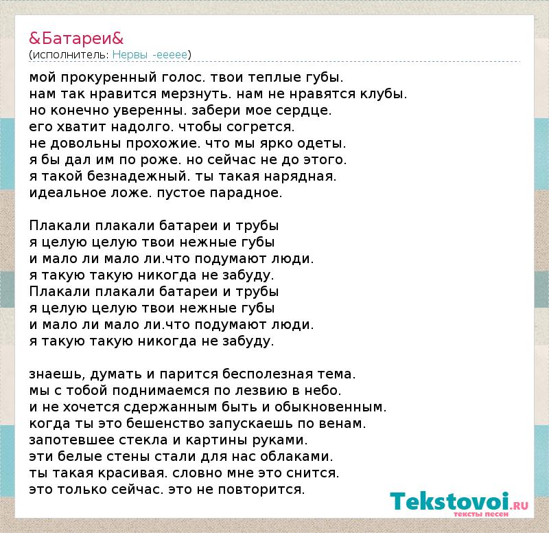 мой прокуренный голос. твои теплые губы. нам так нравится мерзнуть. нам не нравятся клубы. но конечно уверенны. забери мое сердце. его хватит надолго. чтобы согрется. не довольны прохожие. что мы ярко одеты. я бы дал им по роже. но сейчас не до этого. я такой безнадежный. ты такая нарядная. идеальное ложе. пустое парадное. Плакали плакали батареи и трубы я целую целую твои нежные губы и мало ли мало ли.что подумают люди. я такую такую никогда не забуду. Плакали плакали батареи и трубы я целую целую твои нежные губы и мало ли мало ли.что подумают люди. я такую такую никогда не забуду. знаешь, думать и парится бесполезная тема. мы с тобой поднимаемся по лезвию в небо. и не хочется сдержанным быть и обыкновенным. когда ты это бешенство запускаешь по венам. запотевшее стекла и картины руками. эти белые стены стали для нас облаками. ты такая красивая. словно мне это снится. это только сейчас. это не повторится.