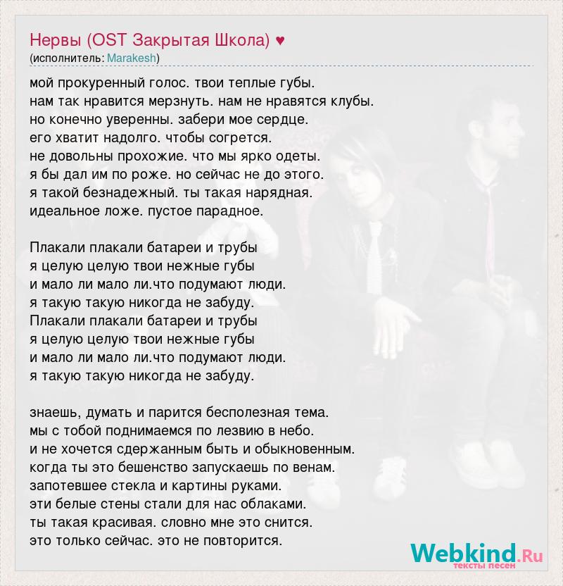 мой прокуренный голос. твои теплые губы. нам так нравится мерзнуть. нам не нравятся клубы. но конечно уверенны. забери мое сердце. его хватит надолго. чтобы согрется. не довольны прохожие. что мы ярко одеты. я бы дал им по роже. но сейчас не до этого. я такой безнадежный. ты такая нарядная. идеальное ложе. пустое парадное. Плакали плакали батареи и трубы я целую целую твои нежные губы и мало ли мало ли.что подумают люди. я такую такую никогда не забуду. Плакали плакали батареи и трубы я целую целую твои нежные губы и мало ли мало ли.что подумают люди. я такую такую никогда не забуду. знаешь, думать и парится бесполезная тема. мы с тобой поднимаемся по лезвию в небо. и не хочется сдержанным быть и обыкновенным. когда ты это бешенство запускаешь по венам. запотевшее стекла и картины руками. эти белые стены стали для нас облаками. ты такая красивая. словно мне это снится. это только сейчас. это не повторится.
