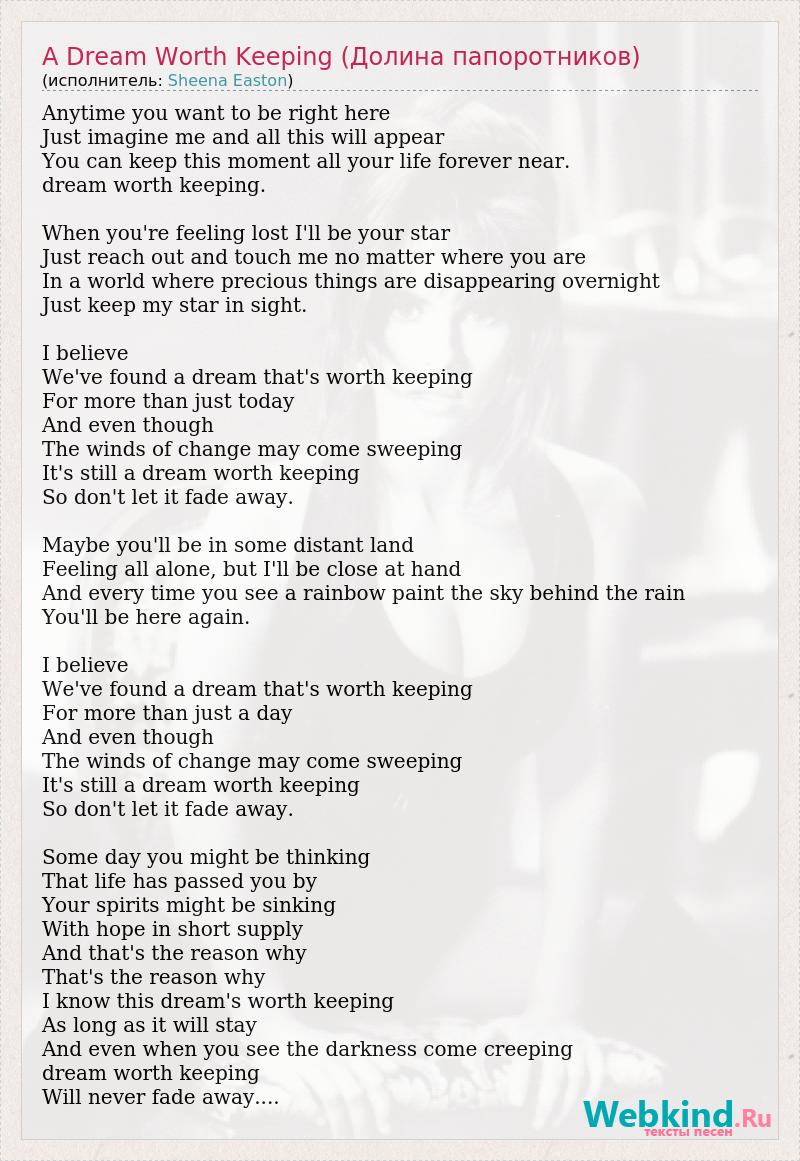 Anytime you want to be right here Just imagine me and all this will appear You can keep this moment all your life forever near. dream worth keeping. When you're feeling lost I'll be your star Just reach out and touch me no matter where you are In a world where precious things are disappearing overnight Just keep my star in sight. I believe We've found a dream that's worth keeping For more than just today And even though The winds of change may come sweeping It's still a dream worth keeping So don't let it fade away. Maybe you'll be in some distant land Feeling all alone, but I'll be close at hand And every time you see a rainbow paint the sky behind the rain You'll be here again. I believe We've found a dream that's worth keeping For more than just a day And even though The winds of change may come sweeping It's still a dream worth keeping So don't let it fade away. Some day you might be thinking That life has passed you by Your spirits might be sinking With hope in short supply And that's the reason why That's the reason why I know this dream's worth keeping As long as it will stay And even when you see the darkness come creeping dream worth keeping Will never fade away....