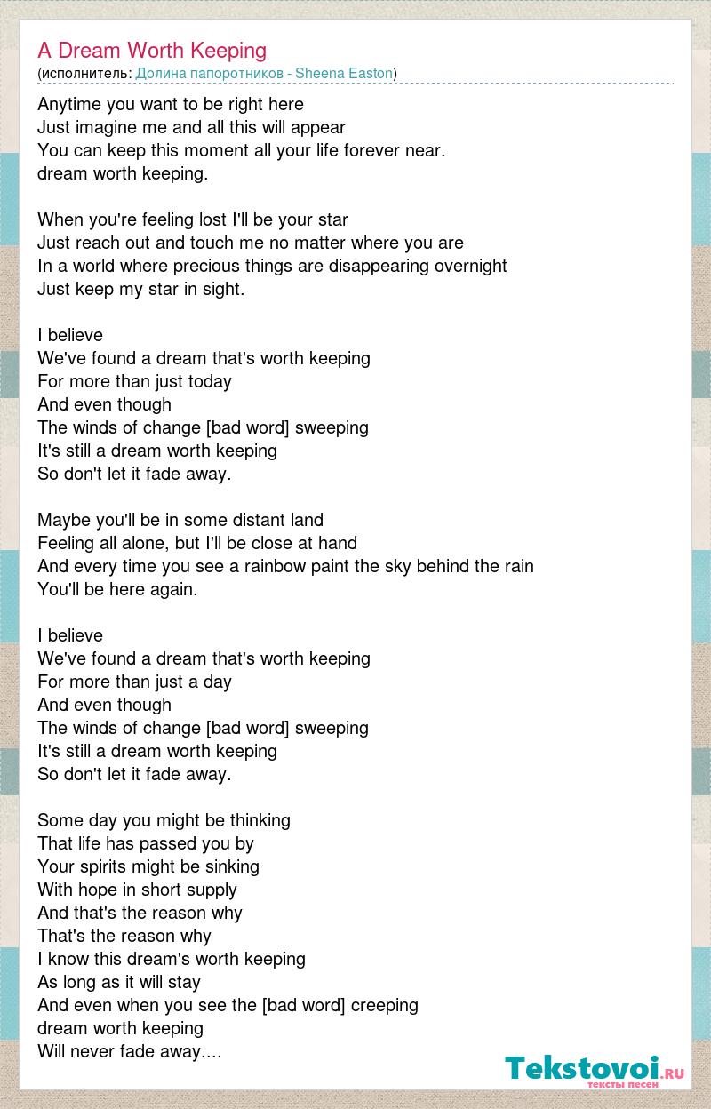 Anytime you want to be right here Just imagine me and all this will appear You can keep this moment all your life forever near. dream worth keeping. When you're feeling lost I'll be your star Just reach out and touch me no matter where you are In a world where precious things are disappearing overnight Just keep my star in sight. I believe We've found a dream that's worth keeping For more than just today And even though The winds of change may come sweeping It's still a dream worth keeping So don't let it fade away. Maybe you'll be in some distant land Feeling all alone, but I'll be close at hand And every time you see a rainbow paint the sky behind the rain You'll be here again. I believe We've found a dream that's worth keeping For more than just a day And even though The winds of change may come sweeping It's still a dream worth keeping So don't let it fade away. Some day you might be thinking That life has passed you by Your spirits might be sinking With hope in short supply And that's the reason why That's the reason why I know this dream's worth keeping As long as it will stay And even when you see the darkness come creeping dream worth keeping Will never fade away....
