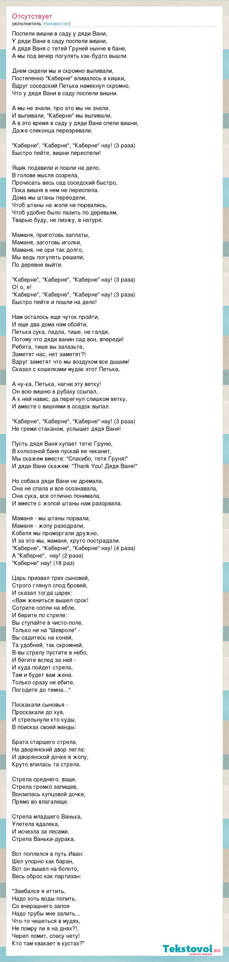 Поспели вишни в саду у дяди Вани, У дяди Вани в саду поспели вишни, А дядя Ваня с тетей Груней нынче в бане, А мы под вечер погулять как-будто вышли. Днем сидели мы и скромно выпивали, Постепенно "Каберне" вливалось в кишки, Вдруг соседский Петька намекнул скромно, Что у дядя Вани в саду поспели вишни. А мы не знали, про это мы не знали, И выпивали, "Каберне" мы выпивали, А в это время в саду у дяди Вани спели вишни, Даже сликонца перезревали. "Каберне", "Каберне", "Каберне" нау! (3 раза) Быстро пейте, вишни переспели! Ящик подавили и пошли на дело, В голове мысля созрела, Прочесать весь сад соседский быстро, Пока вишня в нем не переспела. Дома мы штаны переодели, Чтоб штаны на жопе не порвались, Чтоб удобно было лазить по деревьям, Тварью буду, не пизжу, в натуре. Маманя, приготовь заплаты, Маманя, заготовь иголки, Маманя, не ори так долго, Мы ведь погулять решили, По деревне выйти. "Каберне", "Каберне", "Каберне" нау! (3 раза) О! о, е! "Каберне", "Каберне", "Каберне" нау! (3 раза) Быстро пейте и пошли на дело! Нам осталось еще чуток пройти, И еще два дома нам обойти, Петька сука, падла, тише, не галди, Потому что дяди ванин сад вон, впереди! Ребята, тише вы залазьте, Заметят нас, нет заметят?! Вдруг заметят что мы воздухом все дышим! Сказал с кошелками мудак этот Петька, А ну-ка, Петька, нагни эту ветку! Он всю вишню в рубаху ссыпал, А к ней навис, да перегнул слишком ветку, И вместе с вишнями в осадок выпал. "Каберне", "Каберне", "Каберне" нау! (3 раза) Не греми стаканом, услышит дядя Ваня! Пусть дядя Ваня купает тетю Груню, В колхозной бане пускай ее чеканит, Мы скажем вместе: "Спасибо, тетя Груня!" И дяде Ване скажем: "Thank You! Дядя Ваня!" Но собака дяди Вани не дремала, Она не спала и все осознавала, Она сука, все отлично понимала, И вместе с жопой штаны нам разорвала. Маманя - мы штаны порвали, Маманя - жопу разодрали, Кобеля мы проморгали дружно, И за это мы, маманя, круто пострадали. "Каберне", "Каберне", "Каберне" нау! (4 раза) А "Каберне", нау! (2 раза) "Каберне" нау! (18 раз) Царь призвал трех сыновей, Строго глянул спод бровей, И сказал тогда царек: <Вам жениться вышел срок! Сотрите сопли на ебле, И берите по стреле: Вы ступайте в чисто-поле, Только не на "Шевроле" - Вы садитесь на коней, Та удобней, так скромней, В-вы стрелу пустите в небо, И бегите вслед за ней - И куда пойдет стрела, Там и будет вам жена. Только сразу не ебите, Погодите до темна..." Поскакали сыновья - Проскакали до хуя, И стрельнули кто куды, В поисках своей манды: Брата старшего стрела, На дворянский двор легла: И дворянской дочке в жопу, Круто впилась та стрела. Стрела среднего, ваще, Стрела громко запищев, Вонзилась купцовой дочке, Прямо во влагалище. Стрела младшего Ванька, Улетела вдалека, И исчезла за лесами, Стрела Ваньки-дурака. Вот поплелся в путь Иван: Шел упорно как баран, Вот он вышел на болото, Весь оброс как партизан: "Заебался я иттить, Надо хоть воды попить, Со вчерашнего запоя Надо трубы мне залить... Что-то чешеться в мудях, Не помру ли я на днях?!, Череп ломит, спасу нету! Кто там квакает в кустах?"