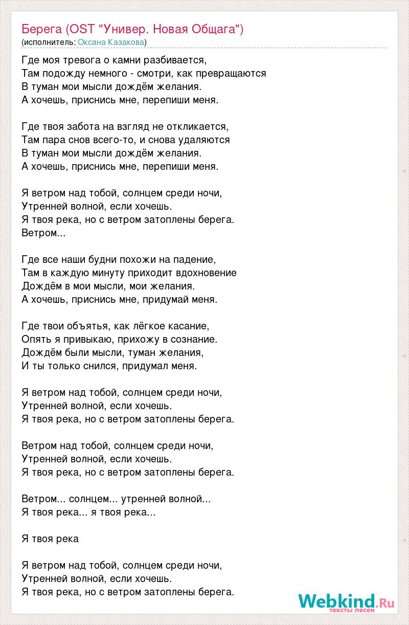 Где моя тревога о камни разбивается, Там подожду немного - смотри, как превращаются В туман мои мысли дождём желания. А хочешь, приснись мне, перепиши меня. Где твоя забота на взгляд не откликается, Там пара снов всего-то, и снова удаляются В туман мои мысли дождём желания. А хочешь, приснись мне, перепиши меня. Я ветром над тобой, солнцем среди ночи, Утренней волной, если хочешь. Я твоя река, но с ветром затоплены берега. Ветром... Где все наши будни похожи на падение, Там в каждую минуту приходит вдохновение Дождём в мои мысли, мои желания. А хочешь, приснись мне, придумай меня. Где твои объятья, как лёгкое касание, Опять я привыкаю, прихожу в сознание. Дождём были мысли, туман желания, И ты только снился, придумал меня. Я ветром над тобой, солнцем среди ночи, Утренней волной, если хочешь. Я твоя река, но с ветром затоплены берега. Ветром над тобой, солнцем среди ночи, Утренней волной, если хочешь. Я твоя река, но с ветром затоплены берега. Ветром... солнцем... утренней волной... Я твоя река... я твоя река... Я твоя река Я ветром над тобой, солнцем среди ночи, Утренней волной, если хочешь. Я твоя река, но с ветром затоплены берега.