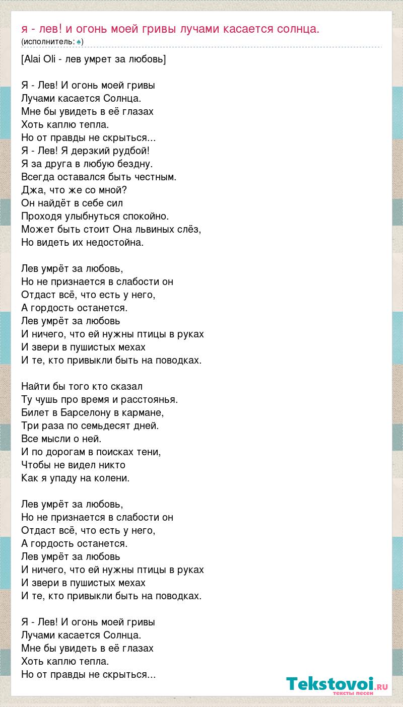 [Alai Oli - лев умрет за любовь] Я - Лев! И огонь моей гривы Лучами касается Солнца. Мне бы увидеть в её глазах Хоть каплю тепла. Но от правды не скрыться... Я - Лев! Я дерзкий рудбой! Я за друга в любую бездну. Всегда оставался быть честным. Джа, что же со мной? Он найдёт в себе сил Проходя улыбнуться спокойно. Может быть стоит Она львиных слёз, Но видеть их недостойна. Лев умрёт за любовь, Но не признается в слабости он Отдаст всё, что есть у него, А гордость останется. Лев умрёт за любовь И ничего, что ей нужны птицы в руках И звери в пушистых мехах И те, кто привыкли быть на поводках. Найти бы того кто сказал Ту чушь про время и расстоянья. Билет в Барселону в кармане, Три раза по семьдесят дней. Все мысли о ней. И по дорогам в поисках тени, Чтобы не видел никто Как я упаду на колени. Лев умрёт за любовь, Но не признается в слабости он Отдаст всё, что есть у него, А гордость останется. Лев умрёт за любовь И ничего, что ей нужны птицы в руках И звери в пушистых мехах И те, кто привыкли быть на поводках. Я - Лев! И огонь моей гривы Лучами касается Солнца. Мне бы увидеть в её глазах Хоть каплю тепла. Но от правды не скрыться...