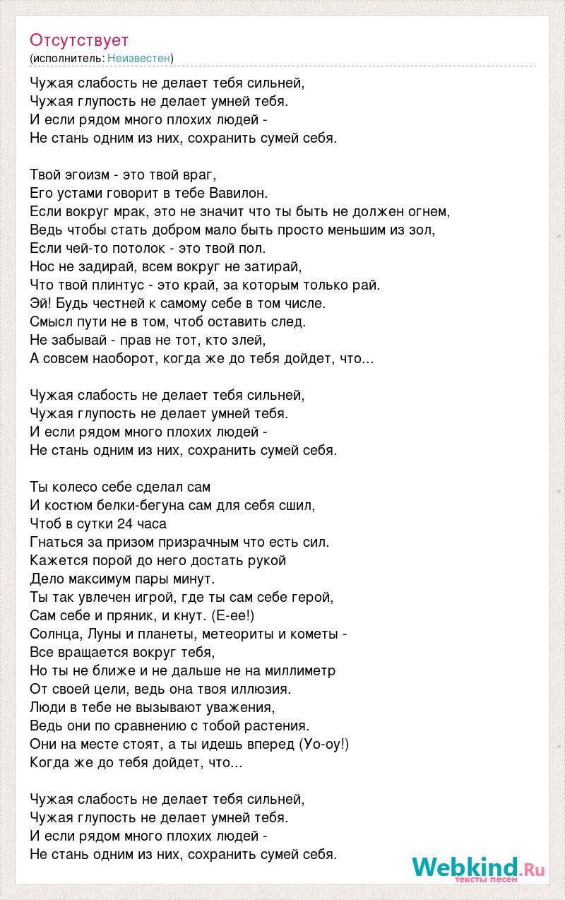 Чужая слабость не делает тебя сильней, Чужая глупость не делает умней тебя. И если рядом много плохих людей - Не стань одним из них, сохранить сумей себя. Твой эгоизм - это твой враг, Его устами говорит в тебе Вавилон. Если вокруг мрак, это не значит что ты быть не должен огнем, Ведь чтобы стать добром мало быть просто меньшим из зол, Если чей-то потолок - это твой пол. Нос не задирай, всем вокруг не затирай, Что твой плинтус - это край, за которым только рай. Эй! Будь честней к самому себе в том числе. Смысл пути не в том, чтоб оставить след. Не забывай - прав не тот, кто злей, А совсем наоборот, когда же до тебя дойдет, что... Чужая слабость не делает тебя сильней, Чужая глупость не делает умней тебя. И если рядом много плохих людей - Не стань одним из них, сохранить сумей себя. Ты колесо себе сделал сам И костюм белки-бегуна сам для себя сшил, Чтоб в сутки 24 часа Гнаться за призом призрачным что есть сил. Кажется порой до него достать рукой Дело максимум пары минут. Ты так увлечен игрой, где ты сам себе герой, Сам себе и пряник, и кнут. (Е-ее!) Солнца, Луны и планеты, метеориты и кометы - Все вращается вокруг тебя, Но ты не ближе и не дальше не на миллиметр От своей цели, ведь она твоя иллюзия. Люди в тебе не вызывают уважения, Ведь они по сравнению с тобой растения. Они на месте стоят, а ты идешь вперед (Уо-оу!) Когда же до тебя дойдет, что... Чужая слабость не делает тебя сильней, Чужая глупость не делает умней тебя. И если рядом много плохих людей - Не стань одним из них, сохранить сумей себя.