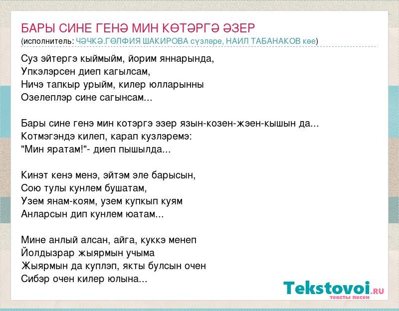Суз эйтергэ кыймыйм, йорим яннарында, Упкэлэрсен диеп кагылсам, Ничэ тапкыр урыйм, килер юлларынны Озелеплэр сине сагынсам... Бары сине генэ мин котэргэ эзер язын-козен-жэен-кышын да... Котмэгэндэ килеп, карап кузлэремэ: "Мин яратам!"- диеп пышылда... Кинэт кенэ менэ, эйтэм эле барысын, Сою тулы кунлем бушатам, Узем янам-коям, узем купкып куям Анларсын дип кунлем юатам... Мине анлый алсан, айга, куккэ менеп Йолдызрар жыярмын учыма Жыярмын да куплэп, якты булсын очен Сибэр очен килер юлына...