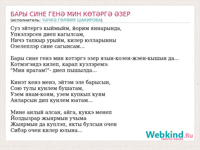 Суз эйтергэ кыймыйм, йорим яннарында, Упкэлэрсен диеп кагылсам, Ничэ тапкыр урыйм, килер юлларынны Озелеплэр сине сагынсам... Бары сине генэ мин котэргэ эзер язын-козен-жэен-кышын да... Котмэгэндэ килеп, карап кузлэремэ: "Мин яратам!"- диеп пышылда... Кинэт кенэ менэ, эйтэм эле барысын, Сою тулы кунлем бушатам, Узем янам-коям, узем купкып куям Анларсын дип кунлем юатам... Мине анлый алсан, айга, куккэ менеп Йолдызрар жыярмын учыма Жыярмын да куплэп, якты булсын очен Сибэр очен килер юлына...