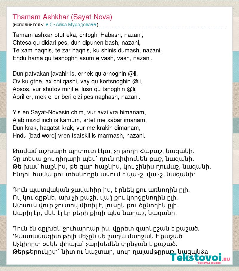 Tamam ashxar ptut eka, chtoghi Habash, nazani, Chtesa qu didari pes, dun dipunen bash, nazani, Te xam haqnis, te zar haqnis, ku shinis dumash, nazani, Endu hama qu tesnoghn asum e vash, vash, nazani. Dun patvakan javahir is, ernek qu arnoghin @li, Ov ku gtne, ax chi qashi, vay qu kortsnoghin @li, Apsos, vur shutov miril e, lusn qu tsnoghin @li, April er, mek el er beri qizi pes naghash, nazani. Yis en Sayat-Novasin chim, vur avzi vra himanam, Ajab mizid inch is kamum, srtet me xabar imanam, Dun krak, haqatst krak, vur me krakin dimanam, Hndu ghalamqaru vren tsatskil is marmash, nazani. Թամամ աշխարհ պըտուտ էկա, չը թողի Հաբաշ, նազանի. Չը տեսա քու դիդարի պես` դուն դիփունեն բաշ, նազանի. Թե խամ հաքնիս, թե զար հաքնիս, կու շինիս ղումաշ, նազանի. Էնդու համա քու տեսնողըն ասում է վա~շ, վա~շ, նազանի: Դուն պատվական ջավահիր իս, է'րնեկ քու առնողին ըլի. Ով կու գըթնե, ախ չի քաշի, վա'յ քու կորցընողին ըլի. Ափսուս վուր շուտով միռիլ է, լուսըն քու ծընողին ըլի. Ապրիլ էր, մեկ էլ էր բերի քիզի պես նաղաշ, նազանի: Դուն էն գըլխեն ջուհարդար իս, վըրետ զարնըշան է քաշած. Դաստամազիտ թիլի մեչըն մե շադա մարջան է քաշած. Աչկիրըտ օսկե փիալա` չարխեմեն փընջան է քաշած. Թերթերուկըտ` նիտ ու նաշտար, սուր ղալամթըրաշ, նազան&a