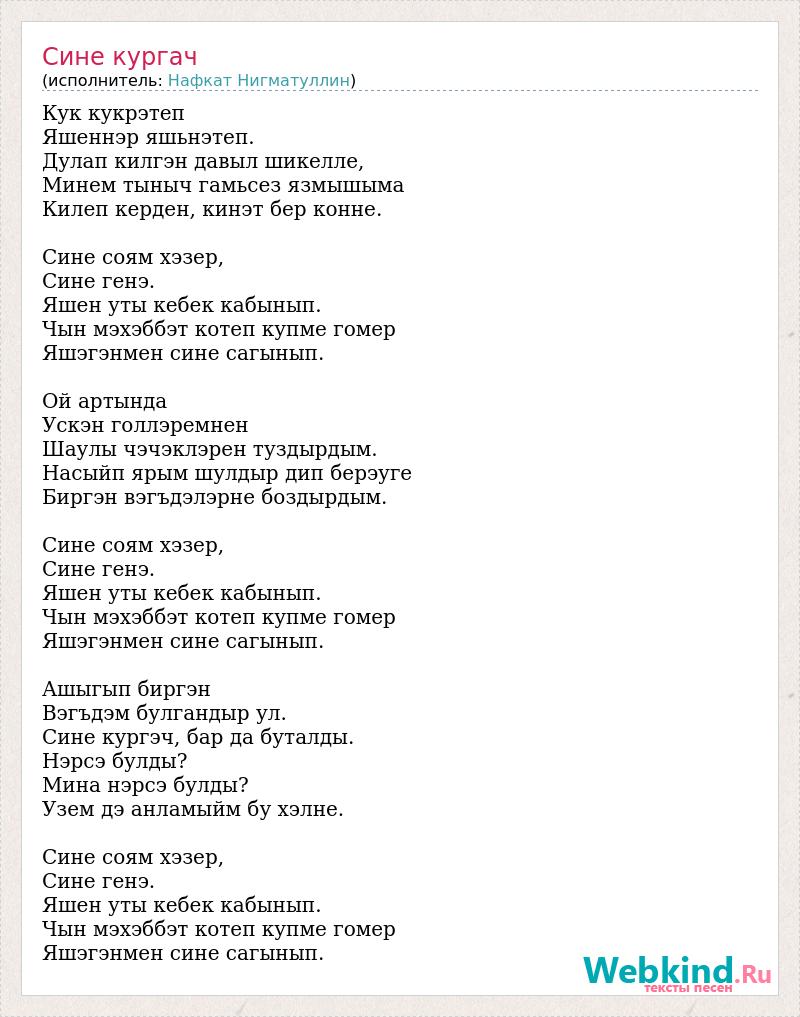 Кук кукрэтеп Яшеннэр яшьнэтеп. Дулап килгэн давыл шикелле, Минем тыныч гамьсез язмышыма Килеп керден, кинэт бер конне. Сине соям хэзер, Сине генэ. Яшен уты кебек кабынып. Чын мэхэббэт котеп купме гомер Яшэгэнмен сине сагынып. Ой артында Ускэн голлэремнен Шаулы чэчэклэрен туздырдым. Насыйп ярым шулдыр дип берэуге Биргэн вэгъдэлэрне боздырдым. Сине соям хэзер, Сине генэ. Яшен уты кебек кабынып. Чын мэхэббэт котеп купме гомер Яшэгэнмен сине сагынып. Ашыгып биргэн Вэгъдэм булгандыр ул. Сине кургэч, бар да буталды. Нэрсэ булды? Мина нэрсэ булды? Узем дэ анламыйм бу хэлне. Сине соям хэзер, Сине генэ. Яшен уты кебек кабынып. Чын мэхэббэт котеп купме гомер Яшэгэнмен сине сагынып.
