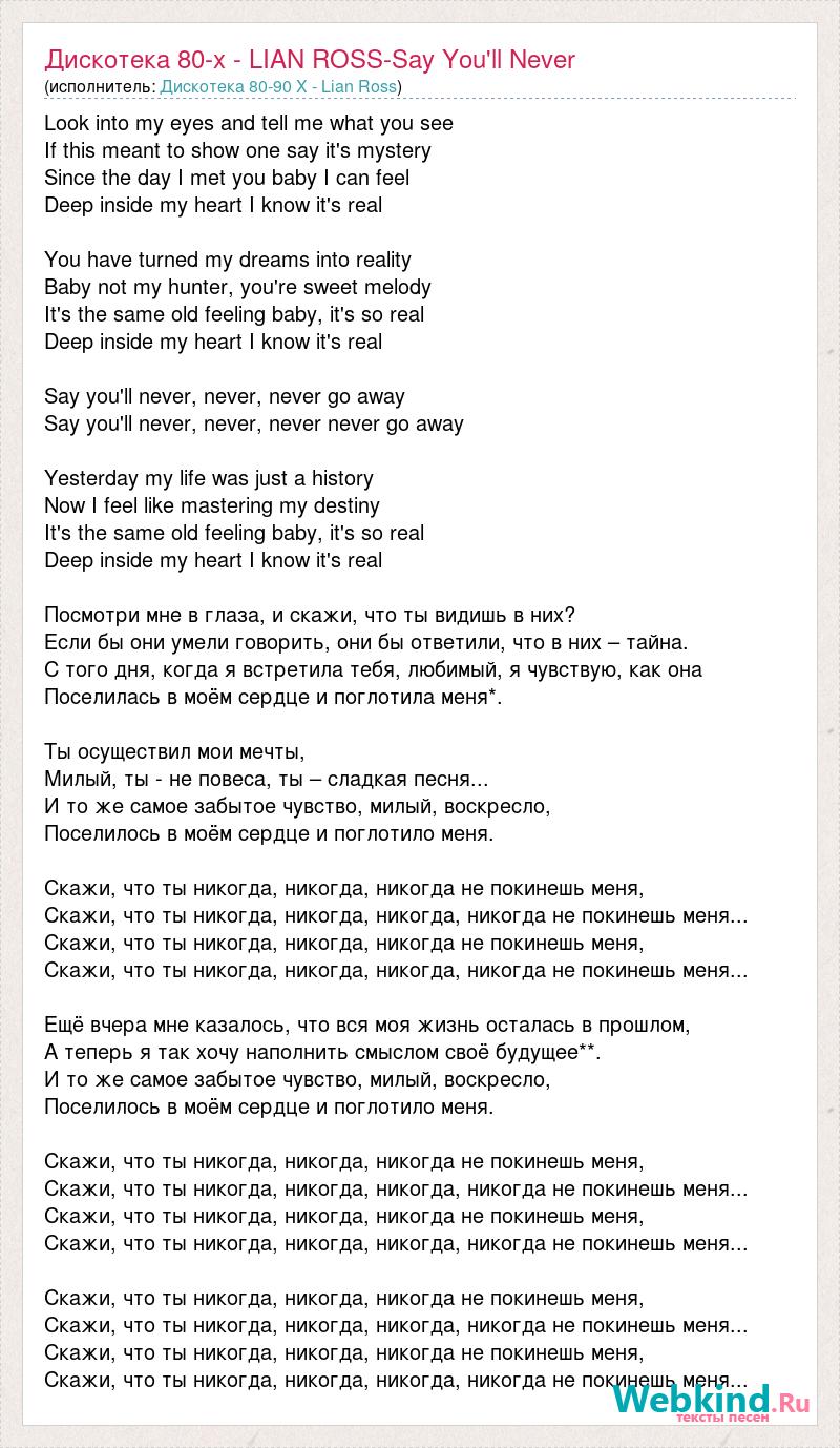 Look into my eyes and tell me what you see If this meant to show one say it's mystery Since the day I met you baby I can feel Deep inside my heart I know it's real You have turned my dreams into reality Baby not my hunter, you're sweet melody It's the same old feeling baby, it's so real Deep inside my heart I know it's real Say you'll never, never, never go away Say you'll never, never, never never go away Yesterday my life was just a history Now I feel like mastering my destiny It's the same old feeling baby, it's so real Deep inside my heart I know it's real Посмотри мне в глаза, и скажи, что ты видишь в них? Если бы они умели говорить, они бы ответили, что в них – тайна. С того дня, когда я встретила тебя, любимый, я чувствую, как она Поселилась в моём сердце и поглотила меня*. Ты осуществил мои мечты, Милый, ты - не повеса, ты – сладкая песня... И то же самое забытое чувство, милый, воскресло, Поселилось в моём сердце и поглотило меня. Скажи, что ты никогда, никогда, никогда не покинешь меня, Скажи, что ты никогда, никогда, никогда, никогда не покинешь меня... Скажи, что ты никогда, никогда, никогда не покинешь меня, Скажи, что ты никогда, никогда, никогда, никогда не покинешь меня... Ещё вчера мне казалось, что вся моя жизнь осталась в прошлом, А теперь я так хочу наполнить смыслом своё будущее**. И то же самое забытое чувство, милый, воскресло, Поселилось в моём сердце и поглотило меня. Скажи, что ты никогда, никогда, никогда не покинешь меня, Скажи, что ты никогда, никогда, никогда, никогда не покинешь меня... Скажи, что ты никогда, никогда, никогда не покинешь меня, Скажи, что ты никогда, никогда, никогда, никогда не покинешь меня... Скажи, что ты никогда, никогда, никогда не покинешь меня, Скажи, что ты никогда, никогда, никогда, никогда не покинешь меня... Скажи, что ты никогда, никогда, никогда не покинешь меня, Скажи, что ты никогда, никогда, никогда, никогда не покинешь меня...