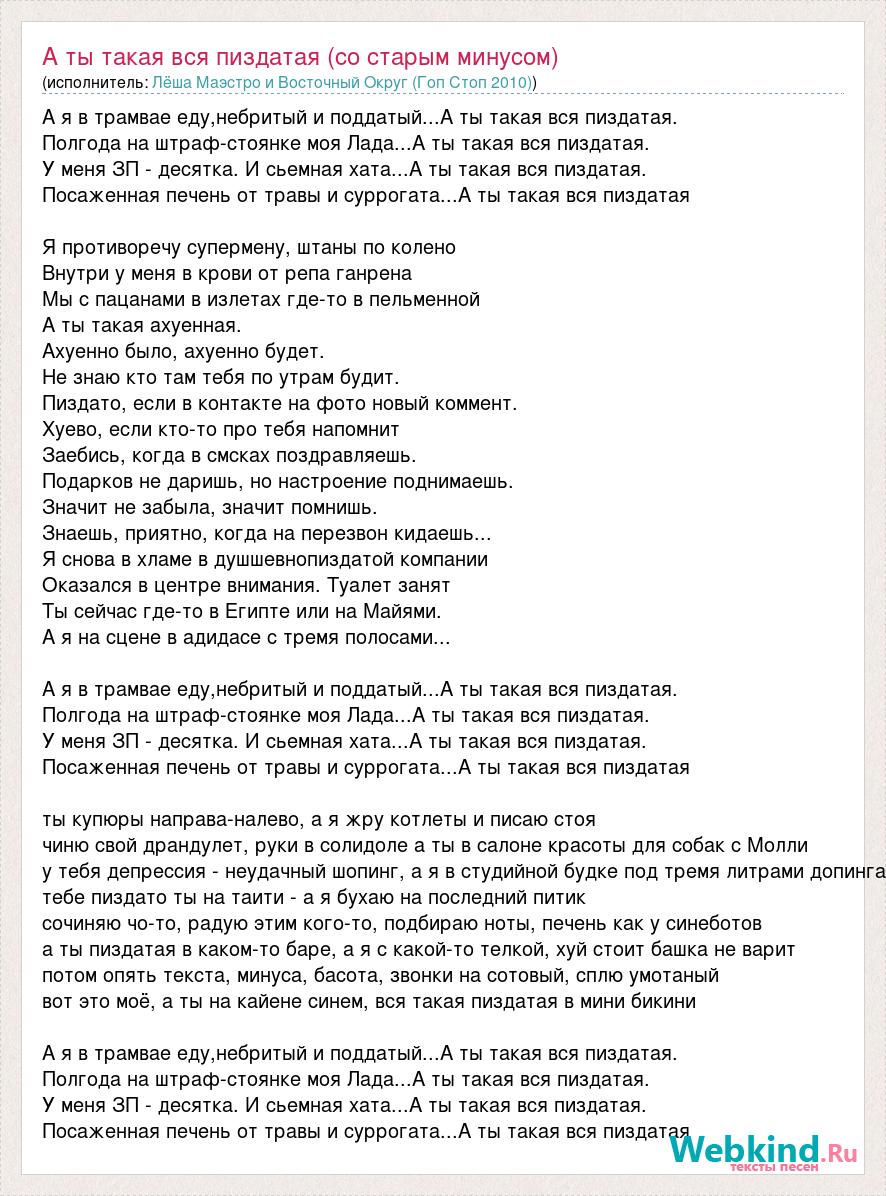 А я в трамвае еду,небритый и поддатый...А ты такая вся пиздатая. Полгода на штраф-стоянке моя Лада...А ты такая вся пиздатая. У меня ЗП - десятка. И сьемная хата...А ты такая вся пиздатая. Посаженная печень от травы и суррогата...А ты такая вся пиздатая Я противоречу супермену, штаны по колено Внутри у меня в крови от репа ганрена Мы с пацанами в излетах где-то в пельменной А ты такая ахуенная. Ахуенно было, ахуенно будет. Не знаю кто там тебя по утрам будит. Пиздато, если в контакте на фото новый коммент. Хуево, если кто-то про тебя напомнит Заебись, когда в смсках поздравляешь. Подарков не даришь, но настроение поднимаешь. Значит не забыла, значит помнишь. Знаешь, приятно, когда на перезвон кидаешь... Я снова в хламе в душшевнопиздатой компании Оказался в центре внимания. Туалет занят Ты сейчас где-то в Египте или на Майями. А я на сцене в адидасе с тремя полосами... А я в трамвае еду,небритый и поддатый...А ты такая вся пиздатая. Полгода на штраф-стоянке моя Лада...А ты такая вся пиздатая. У меня ЗП - десятка. И сьемная хата...А ты такая вся пиздатая. Посаженная печень от травы и суррогата...А ты такая вся пиздатая ты купюры направа-налево, а я жру котлеты и писаю стоя чиню свой драндулет, руки в солидоле а ты в салоне красоты для собак с Молли у тебя депрессия - неудачный шопинг, а я в студийной будке под тремя литрами допинга тебе пиздато ты на таити - а я бухаю на последний питик сочиняю чо-то, радую этим кого-то, подбираю ноты, печень как у синеботов а ты пиздатая в каком-то баре, а я с какой-то телкой, хуй стоит башка не варит потом опять текста, минуса, басота, звонки на сотовый, сплю умотаный вот это моё, а ты на кайене синем, вся такая пиздатая в мини бикини А я в трамвае еду,небритый и поддатый...А ты такая вся пиздатая. Полгода на штраф-стоянке моя Лада...А ты такая вся пиздатая. У меня ЗП - десятка. И сьемная хата...А ты такая вся пиздатая. Посаженная печень от травы и суррогата...А ты такая вся пиздатая