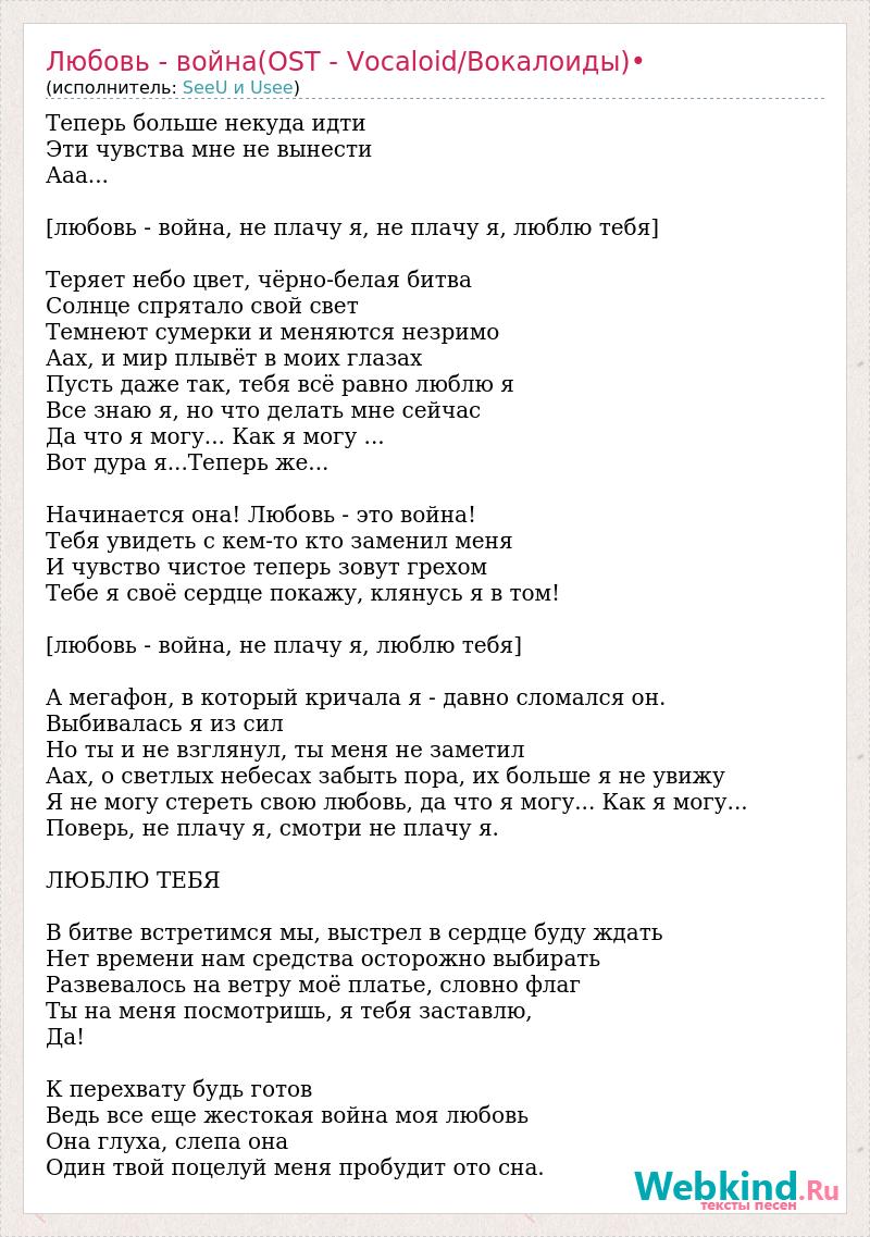 Теперь больше некуда идти Эти чувства мне не вынести Ааа... [любовь - война, не плачу я, не плачу я, люблю тебя] Теряет небо цвет, чёрно-белая битва Солнце спрятало свой свет Темнеют сумерки и меняются незримо Аах, и мир плывёт в моих глазах Пусть даже так, тебя всё равно люблю я Все знаю я, но что делать мне сейчас Да что я могу... Как я могу ... Вот дура я...Теперь же... Начинается она! Любовь - это война! Тебя увидеть с кем-то кто заменил меня И чувство чистое теперь зовут грехом Тебе я своё сердце покажу, клянусь я в том! [любовь - война, не плачу я, люблю тебя] А мегафон, в который кричала я - давно сломался он. Выбивалась я из сил Но ты и не взглянул, ты меня не заметил Аах, о светлых небесах забыть пора, их больше я не увижу Я не могу стереть свою любовь, да что я могу... Как я могу... Поверь, не плачу я, смотри не плачу я. ЛЮБЛЮ ТЕБЯ В битве встретимся мы, выстрел в сердце буду ждать Нет времени нам средства осторожно выбирать Развевалось на ветру моё платье, словно флаг Ты на меня посмотришь, я тебя заставлю, Да! К перехвату будь готов Ведь все еще жестокая война моя любовь Она глуха, слепа она Один твой поцелуй меня пробудит ото сна.