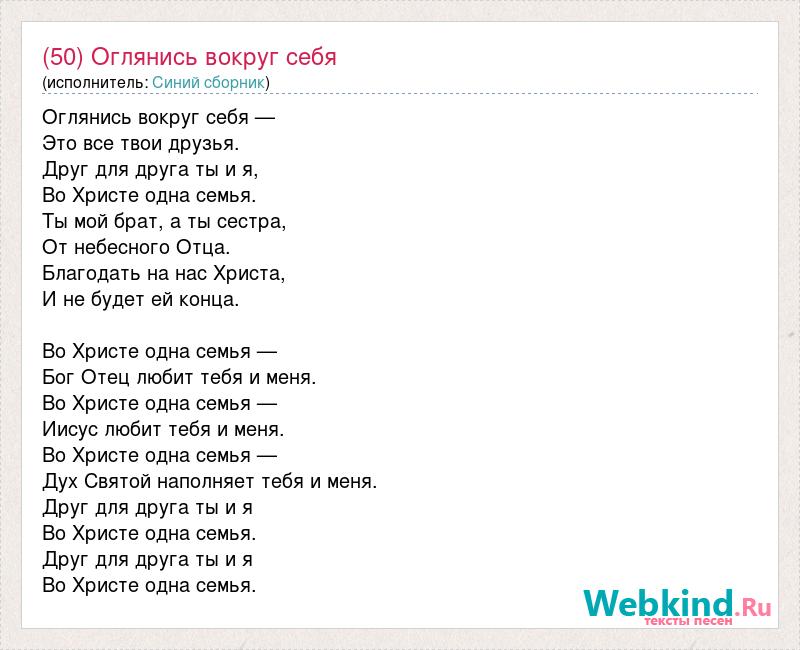 Оглянись вокруг себя — Это все твои друзья. Друг для друга ты и я, Во Христе одна семья. Ты мой брат, а ты сестра, От небесного Отца. Благодать на нас Христа, И не будет ей конца. Во Христе одна семья — Бог Отец любит тебя и меня. Во Христе одна семья — Иисус любит тебя и меня. Во Христе одна семья — Дух Святой наполняет тебя и меня. Друг для друга ты и я Во Христе одна семья. Друг для друга ты и я Во Христе одна семья.