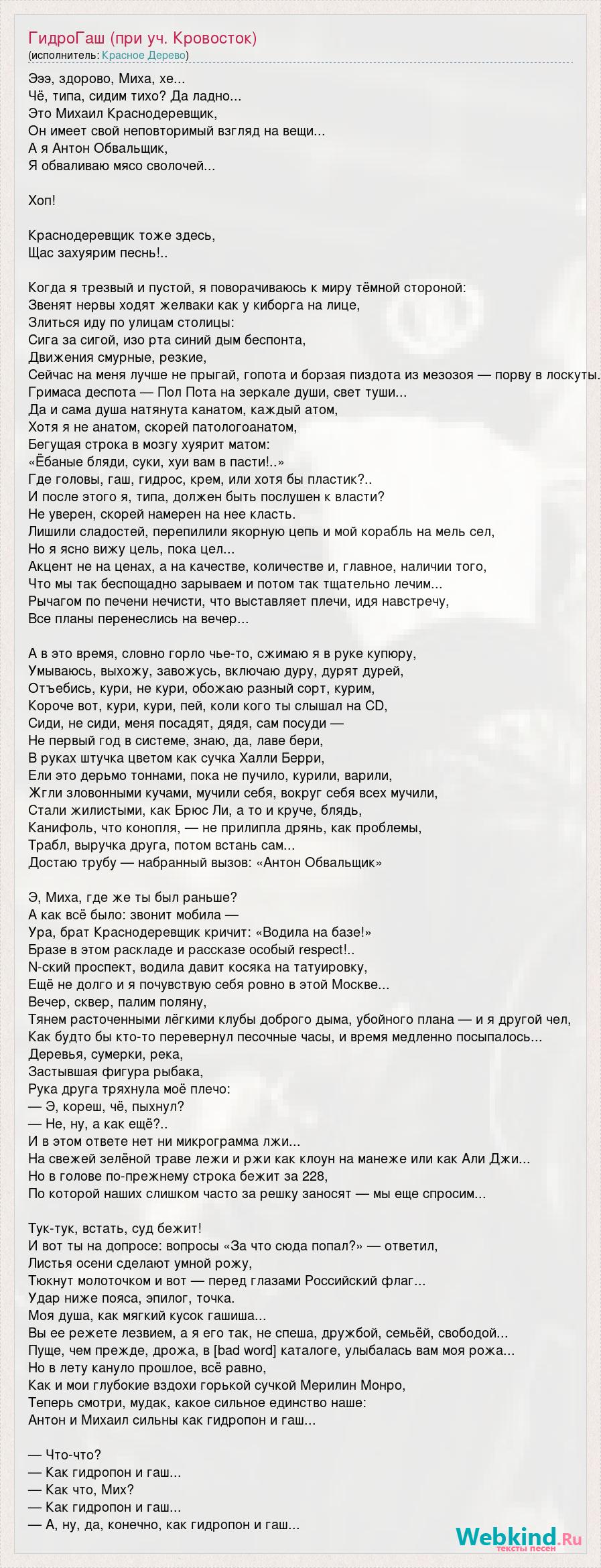 Эээ, здорово, Миха, хе... Чё, типа, сидим тихо? Да ладно... Это Михаил Краснодеревщик, Он имеет свой неповторимый взгляд на вещи... А я Антон Обвальщик, Я обваливаю мясо сволочей... Хоп! Краснодеревщик тоже здесь, Щас захуярим песнь!.. Когда я трезвый и пустой, я поворачиваюсь к миру тёмной стороной: Звенят нервы ходят желваки как у киборга на лице, Злиться иду по улицам столицы: Сига за сигой, изо рта синий дым беспонта, Движения смурные, резкие, Сейчас на меня лучше не прыгай, гопота и борзая пиздота из мезозоя — порву в лоскуты. Гримаса деспота — Пол Пота на зеркале души, свет туши... Да и сама душа натянута канатом, каждый атом, Хотя я не анатом, скорей патологоанатом, Бегущая строка в мозгу хуярит матом: «Ёбаные бляди, суки, хуи вам в пасти!..» Где головы, гаш, гидрос, крем, или хотя бы пластик?.. И после этого я, типа, должен быть послушен к власти? Не уверен, скорей намерен на нее класть. Лишили сладостей, перепилили якорную цепь и мой корабль на мель сел, Но я ясно вижу цель, пока цел... Акцент не на ценах, а на качестве, количестве и, главное, наличии того, Что мы так беспощадно зарываем и потом так тщательно лечим... Рычагом по печени нечисти, что выставляет плечи, идя навстречу, Все планы перенеслись на вечер... А в это время, словно горло чье-то, сжимаю я в руке купюру, Умываюсь, выхожу, завожусь, включаю дуру, дурят дурей, Отъебись, кури, не кури, обожаю разный сорт, курим, Короче вот, кури, кури, пей, коли кого ты слышал на CD, Сиди, не сиди, меня посадят, дядя, сам посуди — Не первый год в системе, знаю, да, лаве бери, В руках штучка цветом как сучка Халли Берри, Ели это дерьмо тоннами, пока не пучило, курили, варили, Жгли зловонными кучами, мучили себя, вокруг себя всех мучили, Стали жилистыми, как Брюс Ли, а то и круче, блядь, Канифоль, что конопля, — не прилипла дрянь, как проблемы, Трабл, выручка друга, потом встань сам... Достаю трубу — набранный вызов: «Антон Обвальщик» Э, Миха, где же ты был раньше? А как всё было: звонит мобила — Ура, брат Краснодеревщик кричит: «Водила на базе!» Бразе в этом раскладе и рассказе особый respect!.. N-ский проспект, водила давит косяка на татуировку, Ещё не долго и я почувствую себя ровно в этой Москве... Вечер, сквер, палим поляну, Тянем расточенными лёгкими клубы доброго дыма, убойного плана — и я другой чел, Как будто бы кто-то перевернул песочные часы, и время медленно посыпалось... Деревья, сумерки, река, Застывшая фигура рыбака, Рука друга тряхнула моё плечо: — Э, кореш, чё, пыхнул? — Не, ну, а как ещё?.. И в этом ответе нет ни микрограмма лжи... На свежей зелёной траве лежи и ржи как клоун на манеже или как Али Джи... Но в голове по-прежнему строка бежит за 228, По которой наших слишком часто за решку заносят — мы еще спросим... Тук-тук, встать, суд бежит! И вот ты на допросе: вопросы «За что сюда попал?» — ответил, Листья осени сделают умной рожу, Тюкнут молоточком и вот — перед глазами Российский флаг... Удар ниже пояса, эпилог, точка. Моя душа, как мягкий кусок гашиша... Вы ее режете лезвием, а я его так, не спеша, дружбой, семьёй, свободой... Пуще, чем прежде, дрожа, в [bad word] каталоге, улыбалась вам моя рожа... Но в лету кануло прошлое, всё равно, Как и мои глубокие вздохи горькой сучкой Мерилин Монро, Теперь смотри, мудак, какое сильное единство наше: Антон и Михаил сильны как гидропон и гаш... — Что-что? — Как гидропон и гаш... — Как что, Мих? — Как гидропон и гаш... — А, ну