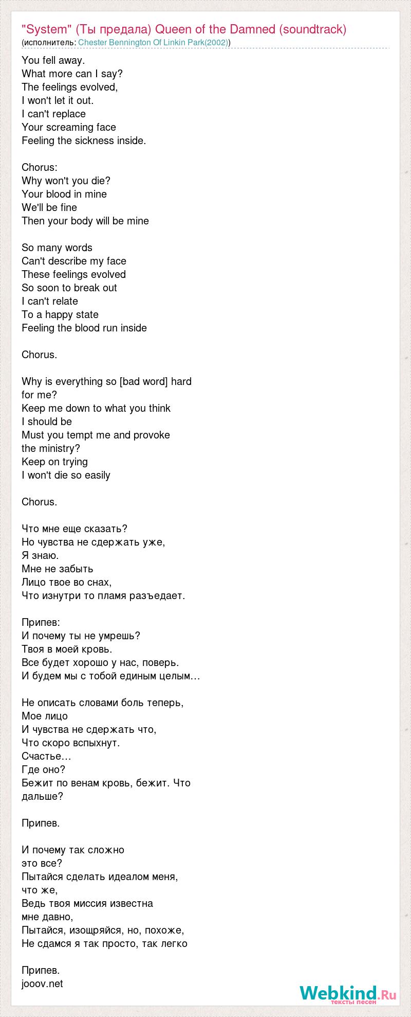 А как ты думаешь, о чем песня ""System" (Ты предала) Queen of the Damned (soundtrack)" ?