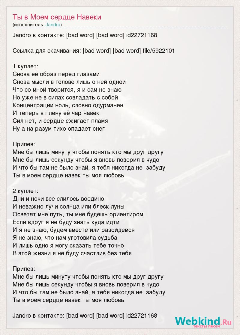 Jandro в контакте: [bad word] [bad word] id22721168 Ссылка для скачивания: [bad word] [bad word] file/5922101 1 куплет: Снова её образ перед глазами Снова мысли в голове лишь о ней одной Что со мной творится, я и сам не знаю Но уже не в силах совладать с собой Концентрации ноль, словно одурманен И теперь в плену её чар навек Сил нет, и сердце сжигает пламя Ну а на разум тихо опадает снег Припев: Мне бы лишь минуту чтобы понять кто мы друг другу Мне бы лишь секунду чтобы я вновь поверил в чудо И что бы там не было знай, я тебя никогда не забуду Ты в моем сердце навек ты моя любовь 2 куплет: Дни и ночи все слилось воедино И неважно лучи солнца или блеск луны Осветят мне путь, ты мне будешь ориентиром Если вдруг я не буду знать куда идти И я не знаю, будем вместе или разойдемся Я не знаю, что нам уготовила судьба И лишь одно я могу сказать тебе точно В этой жизни я не буду счастлив без тебя Припев: Мне бы лишь минуту чтобы понять кто мы друг другу Мне бы лишь секунду чтобы я вновь поверил в чудо И что бы там не было знай, я тебя никогда не забуду Ты в моем сердце навек ты моя любовь Jandro в контакте: [bad word] [bad word] id22721168