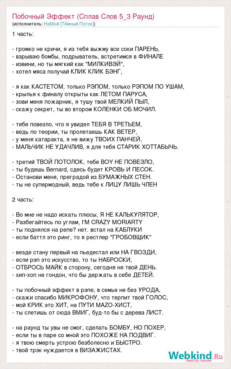 1 часть: - громко не кричи, я из тебя выжму все соки ПАРЕНЬ, - взрываю бомбы, подрыватель, встретимся в ФИНАЛЕ - извини, но ты мягкий как "МИЛКИВЭЙ", - хотел мяса получай КЛИК КЛИК БЭНГ, - я как КАСТЕТОМ, только РЭПОМ, только РЭПОМ ПО УШАМ, - крылья к финалу открыты как ЛЕТОМ ПАРУСА, - зови меня пожарник, я тушу твой МЕЛКИЙ ПЫЛ, - скажу секрет, ты во втором КОЛЕНКИ ОБ МОЧИЛ. - тебе повезло, что я увидел ТЕБЯ В ТРЕТЬЕМ, - ведь по теории, ты пролетаешь КАК ВЕТЕР, - у меня катаракта, я не вижу ТВОИХ ПАНЧЕЙ, - МАЛЬЧИК НЕ УДАЧЛИВ, я для тебя СТАРИК ХОТТАБЫЧЬ. - третий ТВОЙ ПОТОЛОК, тебе BOY НЕ ПОВЕЗЛО, - ты будешь Bernard, сдесь будет КРОВЬ И ПЕСОК. - Останови меня, преградой из БУМАЖНЫХ СТЕН. - ты не супермодный, ведь тебе к ЛИЦУ ЛИШЬ ЧЛЕН 2 часть: - Во мне не надо искать плюсы, Я НЕ КАЛЬКУЛЯТОР, - Разбегайтесь по углам, I'M CRAZY MORIARTY - ты поднялся на репе? нет. встал на КАБЛУКИ - если баттл это ринг, то я рестлер "ГРОБОВЩИК" - везде стану первый на пьедестал или НА ГВОЗДИ, - если рэп это искусство, то ты НАБРОСКИ, - ОТБРОСЬ МАЙК в сторону, сегодня не твой ДЕНЬ. - хип-хоп не гондон, что бы держать в себе ДЕТЕЙ. - ты побочный эффект в рэпе, в семье не без УРОДА, - скажи спасибо МИКРОФОНУ, что терпит твой ГОЛОС, - мой КРИК это ХИТ, на ПУТИ МАZО-ХИСТ, - ты слетишь от сюда ВМИГ, буд-то бы с дерева ЛИСТ. - на раунд ты увы не смог, сделать БОМБУ, НО ПОХЕР, - если ты в паре со мной это ПОХОЖЕ НА ПОДВИГ. - я твою смерть устрою безболесно и БЫСТРО. - твой трэк нуждается в ВИЗАЖИСТАХ.