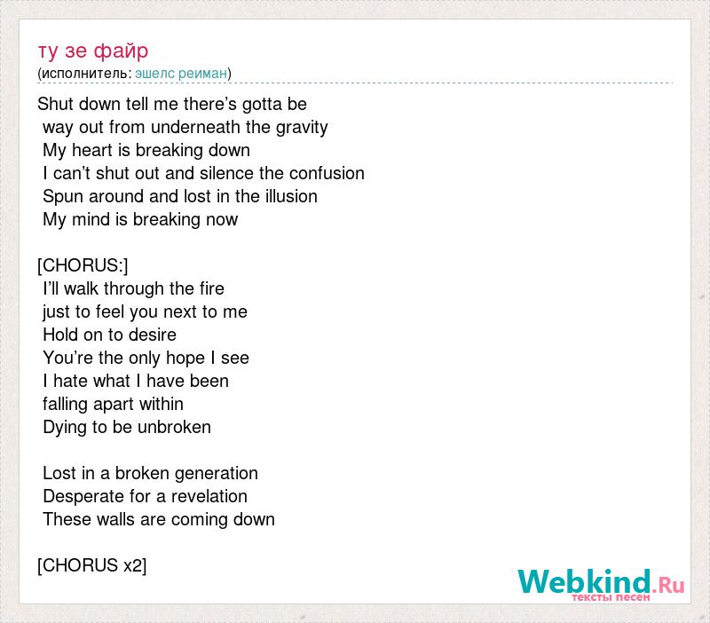 Shut down tell me there’s gotta be way out from underneath the gravity My heart is breaking down I can’t shut out and silence the confusion Spun around and lost in the illusion My mind is breaking now [CHORUS:] I’ll walk through the fire just to feel you next to me Hold on to desire You’re the only hope I see I hate what I have been falling apart within Dying to be unbroken Lost in a broken generation Desperate for a revelation These walls are coming down [CHORUS x2]