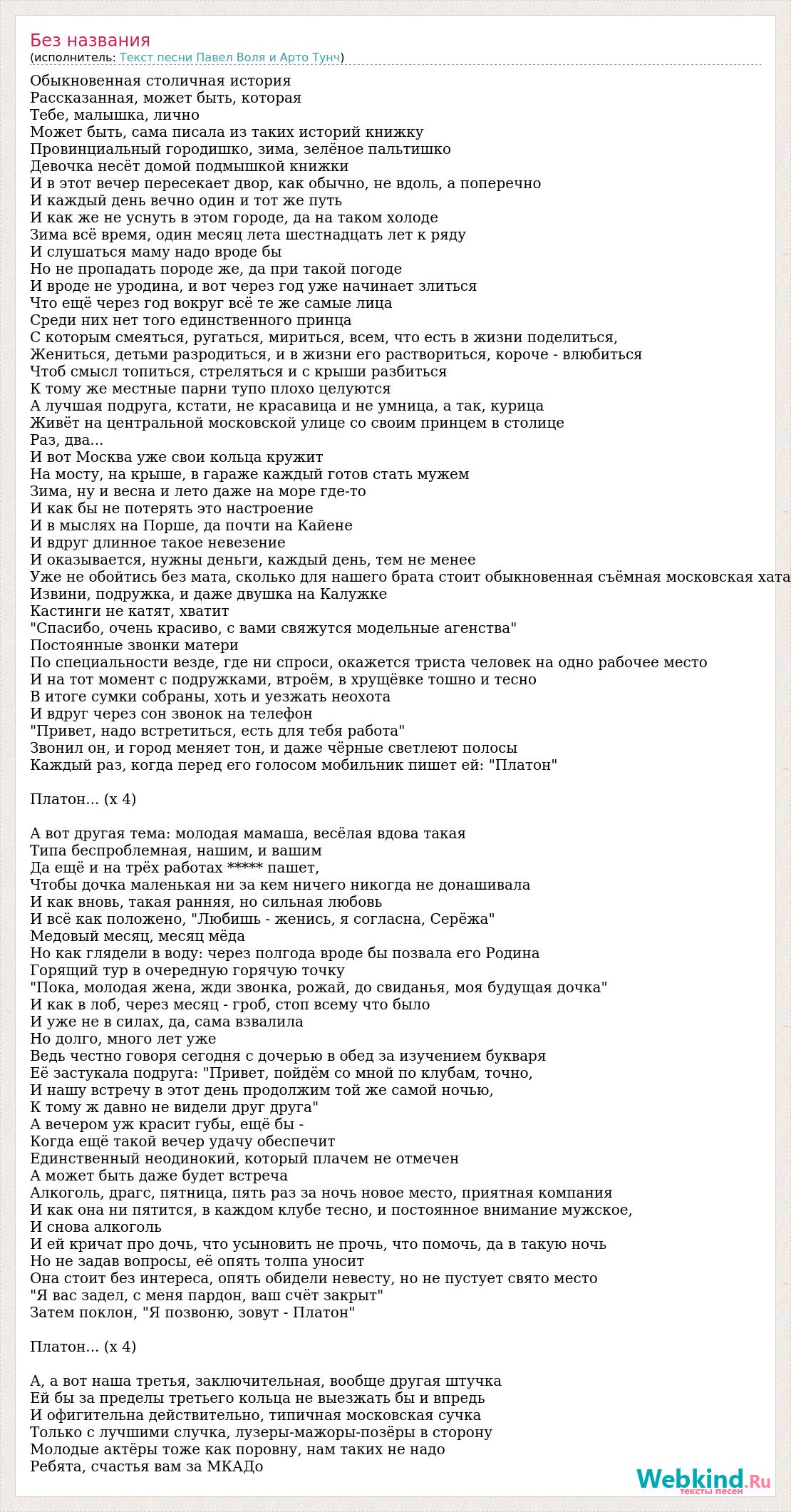 Обыкновенная столичная история Рассказанная, может быть, которая Тебе, малышка, лично Может быть, сама писала из таких историй книжку Провинциальный городишко, зима, зелёное пальтишко Девочка несёт домой подмышкой книжки И в этот вечер пересекает двор, как обычно, не вдоль, а поперечно И каждый день вечно один и тот же путь И как же не уснуть в этом городе, да на таком холоде Зима всё время, один месяц лета шестнадцать лет к ряду И слушаться маму надо вроде бы Но не пропадать породе же, да при такой погоде И вроде не уродина, и вот через год уже начинает злиться Что ещё через год вокруг всё те же самые лица Среди них нет того единственного принца С которым смеяться, ругаться, мириться, всем, что есть в жизни поделиться, Жениться, детьми разродиться, и в жизни его раствориться, короче - влюбиться Чтоб смысл топиться, стреляться и с крыши разбиться К тому же местные парни тупо плохо целуются А лучшая подруга, кстати, не красавица и не умница, а так, курица Живёт на центральной московской улице со своим принцем в столице Раз, два... И вот Москва уже свои кольца кружит На мосту, на крыше, в гараже каждый готов стать мужем Зима, ну и весна и лето даже на море где-то И как бы не потерять это настроение И в мыслях на Порше, да почти на Кайене И вдруг длинное такое невезение И оказывается, нужны деньги, каждый день, тем не менее Уже не обойтись без мата, сколько для нашего брата стоит обыкновенная съёмная московская хата Извини, подружка, и даже двушка на Калужке Кастинги не катят, хватит "Спасибо, очень красиво, с вами свяжутся модельные агенства" Постоянные звонки матери По специальности везде, где ни спроси, окажется триста человек на одно рабочее место И на тот момент с подружками, втроём, в хрущёвке тошно и тесно В итоге сумки собраны, хоть и уезжать неохота И вдруг через сон звонок на телефон "Привет, надо встретиться, есть для тебя работа" Звонил он, и город меняет тон, и даже чёрные светлеют полосы Каждый раз, когда перед его голосом мобильник пишет ей: "Платон" Платон... (x 4) А вот другая тема: молодая мамаша, весёлая вдова такая Типа беспроблемная, нашим, и вашим Да ещё и на трёх работах ***** пашет, Чтобы дочка маленькая ни за кем ничего никогда не донашивала И как вновь, такая ранняя, но сильная любовь И всё как положено, "Любишь - женись, я согласна, Серёжа" Медовый месяц, месяц мёда Но как глядели в воду: через полгода вроде бы позвала его Родина Горящий тур в очередную горячую точку "Пока, молодая жена, жди звонка, рожай, до свиданья, моя будущая дочка" И как в лоб, через месяц - гроб, стоп всему что было И уже не в силах, да, сама взвалила Но долго, много лет уже Ведь честно говоря сегодня с дочерью в обед за изучением букваря Её застукала подруга: "Привет, пойдём со мной по клубам, точно, И нашу встречу в этот день продолжим той же самой ночью, К тому ж давно не видели друг друга" А вечером уж красит губы, ещё бы - Когда ещё такой вечер удачу обеспечит Единственный неодинокий, который плачем не отмечен А может быть даже будет встреча Алкоголь, драгс, пятница, пять раз за ночь новое место, приятная компания И как она ни пятится, в каждом клубе тесно, и постоянное внимание мужское, И снова алкоголь И ей кричат про дочь, что усыновить не прочь, что помочь, да в такую ночь Но не задав вопросы, её опять толпа уносит Она стоит без интереса, опять обидели невесту, но не пустует свято ме