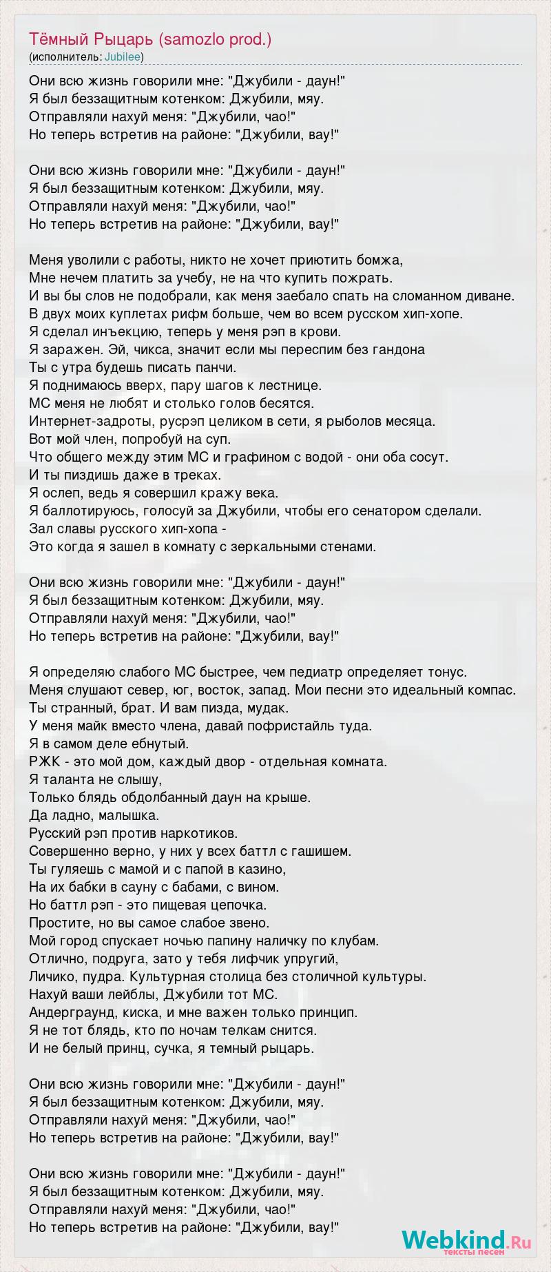 Они всю жизнь говорили мне: "Джубили - даун!" Я был беззащитным котенком: Джубили, мяу. Отправляли нахуй меня: "Джубили, чао!" Но теперь встретив на районе: "Джубили, вау!" Они всю жизнь говорили мне: "Джубили - даун!" Я был беззащитным котенком: Джубили, мяу. Отправляли нахуй меня: "Джубили, чао!" Но теперь встретив на районе: "Джубили, вау!" Меня уволили с работы, никто не хочет приютить бомжа, Мне нечем платить за учебу, не на что купить пожрать. И вы бы слов не подобрали, как меня заебало спать на сломанном диване. В двух моих куплетах рифм больше, чем во всем русском хип-хопе. Я сделал инъекцию, теперь у меня рэп в крови. Я заражен. Эй, чикса, значит если мы переспим без гандона Ты с утра будешь писать панчи. Я поднимаюсь вверх, пару шагов к лестнице. МС меня не любят и столько голов бесятся. Интернет-задроты, русрэп целиком в сети, я рыболов месяца. Вот мой член, попробуй на суп. Что общего между этим МС и графином с водой - они оба сосут. И ты пиздишь даже в треках. Я ослеп, ведь я совершил кражу века. Я баллотируюсь, голосуй за Джубили, чтобы его сенатором сделали. Зал славы русского хип-хопа - Это когда я зашел в комнату с зеркальными стенами. Они всю жизнь говорили мне: "Джубили - даун!" Я был беззащитным котенком: Джубили, мяу. Отправляли нахуй меня: "Джубили, чао!" Но теперь встретив на районе: "Джубили, вау!" Я определяю слабого МС быстрее, чем педиатр определяет тонус. Меня слушают север, юг, восток, запад. Мои песни это идеальный компас. Ты странный, брат. И вам пизда, мудак. У меня майк вместо члена, давай пофристайль туда. Я в самом деле ебнутый. РЖК - это мой дом, каждый двор - отдельная комната. Я таланта не слышу, Только блядь обдолбанный даун на крыше. Да ладно, малышка. Русский рэп против наркотиков. Совершенно верно, у них у всех баттл с гашишем. Ты гуляешь с мамой и с папой в казино, На их бабки в сауну с бабами, с вином. Но баттл рэп - это пищевая цепочка. Простите, но вы самое слабое звено. Мой город спускает ночью папину наличку по клубам. Отлично, подруга, зато у тебя лифчик упругий, Личико, пудра. Культурная столица без столичной культуры. Нахуй ваши лейблы, Джубили тот МС. Андерграунд, киска, и мне важен только принцип. Я не тот блядь, кто по ночам телкам снится. И не белый принц, сучка, я темный рыцарь. Они всю жизнь говорили мне: "Джубили - даун!" Я был беззащитным котенком: Джубили, мяу. Отправляли нахуй меня: "Джубили, чао!" Но теперь встретив на районе: "Джубили, вау!" Они всю жизнь говорили мне: "Джубили - даун!" Я был беззащитным котенком: Джубили, мяу. Отправляли нахуй меня: "Джубили, чао!" Но теперь встретив на районе: "Джубили, вау!"