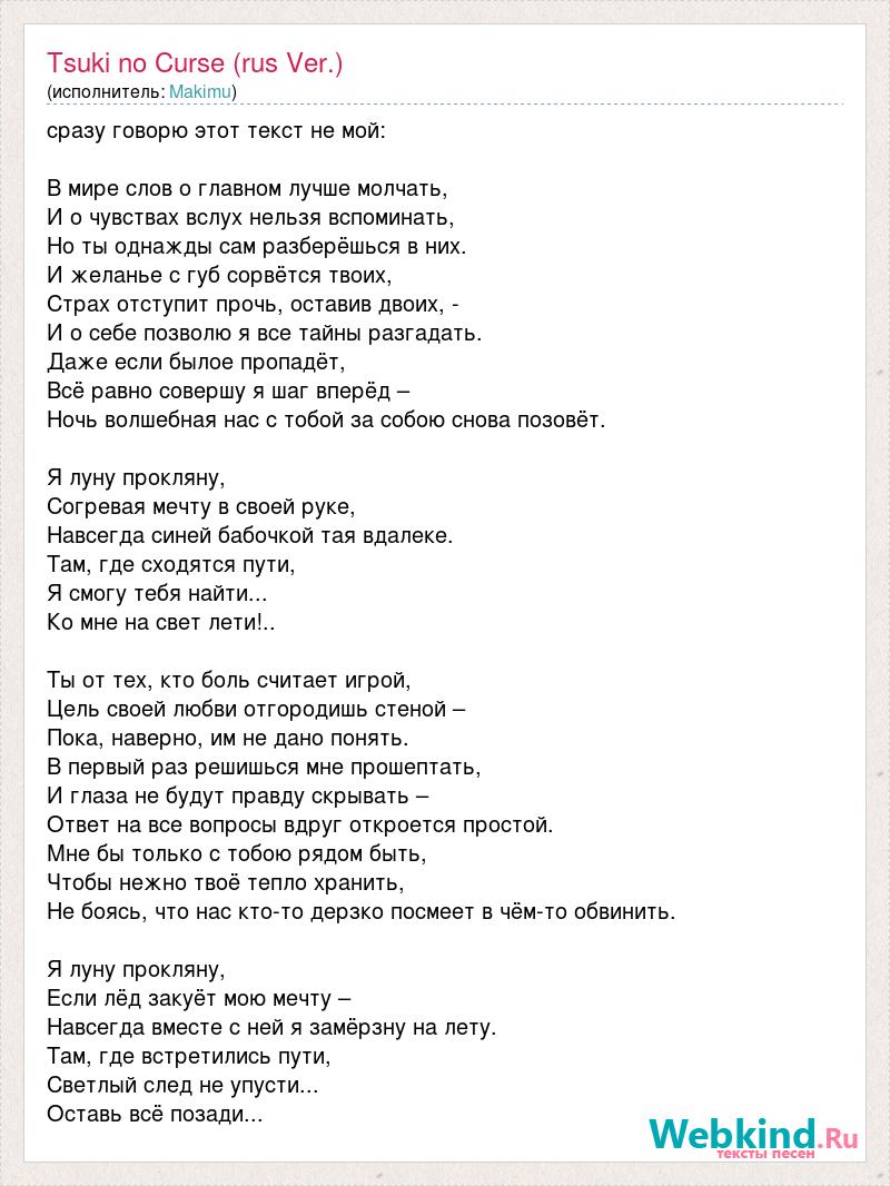 сразу говорю этот текст не мой: В мире слов о главном лучше молчать, И о чувствах вслух нельзя вспоминать, Но ты однажды сам разберёшься в них. И желанье с губ сорвётся твоих, Страх отступит прочь, оставив двоих, - И о себе позволю я все тайны разгадать. Даже если былое пропадёт, Всё равно совершу я шаг вперёд – Ночь волшебная нас с тобой за собою снова позовёт. Я луну прокляну, Согревая мечту в своей руке, Навсегда синей бабочкой тая вдалеке. Там, где сходятся пути, Я смогу тебя найти... Ко мне на свет лети!.. Ты от тех, кто боль считает игрой, Цель своей любви отгородишь стеной – Пока, наверно, им не дано понять. В первый раз решишься мне прошептать, И глаза не будут правду скрывать – Ответ на все вопросы вдруг откроется простой. Мне бы только с тобою рядом быть, Чтобы нежно твоё тепло хранить, Не боясь, что нас кто-то дерзко посмеет в чём-то обвинить. Я луну прокляну, Если лёд закуёт мою мечту – Навсегда вместе с ней я замёрзну на лету. Там, где встретились пути, Светлый след не упусти... Оставь всё позади...