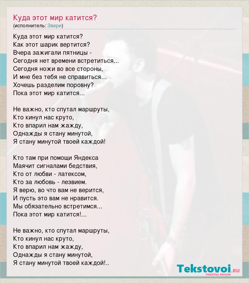 Куда этот мир катится? Как этот шарик вертится? Вчера зажигали пятницы - Сегодня нет времени встретиться... Сегодня ножи во все стороны, И мне без тебя не справиться... Хочешь разделим поровну? Пока этот мир катится... Не важно, кто спутал маршруты, Кто кинул нас круто, Кто впарил нам жажду, Однажды я стану минутой, Я стану минутой твоей каждой! Кто там при помощи Яндекса Маячит сигналами бедствия, Кто от любви - латексом, Кто за любовь - лезвием. Я верю, во что вам не верится, И пусть это вам не нравится. Мы обязательно встретимся... Пока этот мир катится!... Не важно, кто спутал маршруты, Кто кинул нас круто, Кто впарил нам жажду, Однажды я стану минутой, Я стану минутой твоей каждой!..