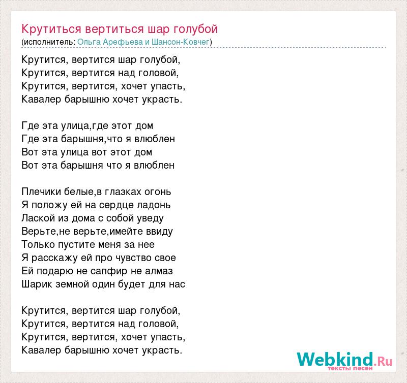 Крутится, вертится шар голубой, Крутится, вертится над головой, Крутится, вертится, хочет упасть, Кавалер барышню хочет украсть. Где эта улица,где этот дом Где эта барышня,что я влюблен Вот эта улица вот этот дом Вот эта барышня что я влюблен Плечики белые,в глазках огонь Я положу ей на сердце ладонь Лаской из дома с собой уведу Верьте,не верьте,имейте ввиду Только пустите меня за нее Я расскажу ей про чувство свое Ей подарю не сапфир не алмаз Шарик земной один будет для нас Крутится, вертится шар голубой, Крутится, вертится над головой, Крутится, вертится, хочет упасть, Кавалер барышню хочет украсть.