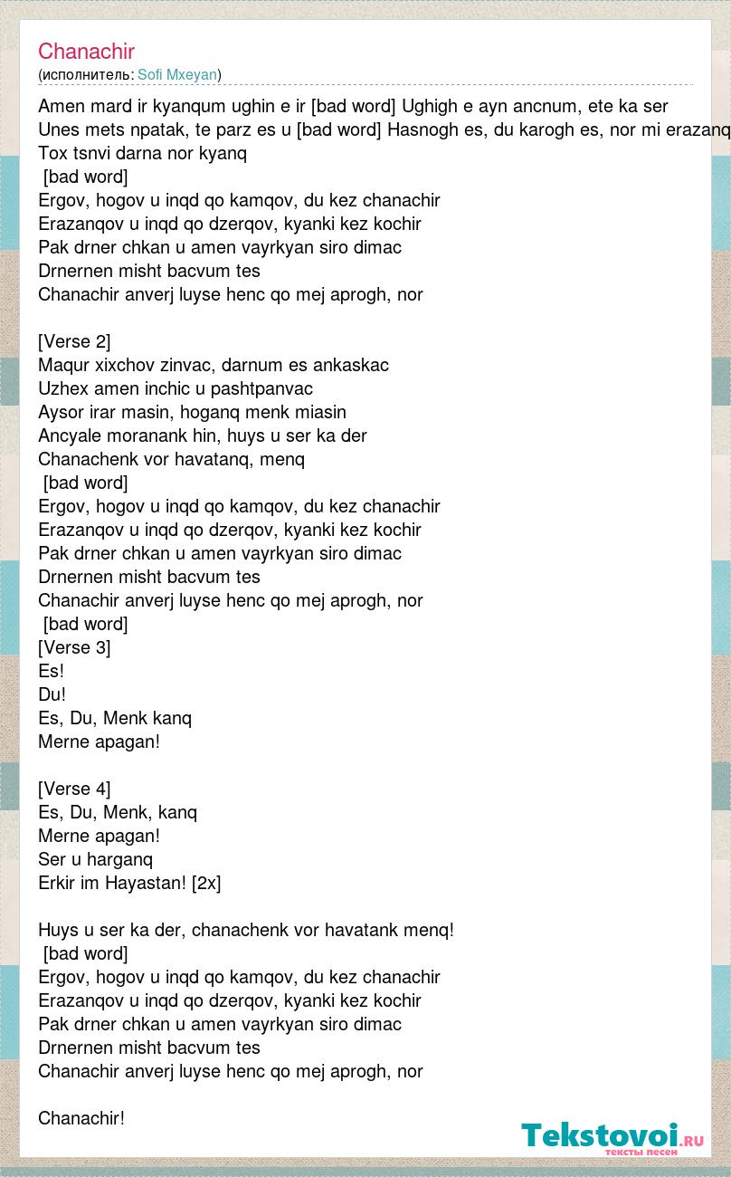 Amen mard ir kyanqum ughin e ir entrum Ughigh e ayn ancnum, ete ka ser Unes mets npatak, te parz es u [bad word] Hasnogh es, du karogh es, nor mi erazanq Tox tsnvi darna nor kyanq [Chorus] Ergov, hogov u inqd qo kamqov, du kez chanachir Erazanqov u inqd qo dzerqov, kyanki kez kochir Pak drner chkan u amen vayrkyan siro dimac Drnernen misht bacvum tes Chanachir anverj luyse henc qo mej aprogh, nor [Verse 2] Maqur xixchov zinvac, darnum es ankaskac Uzhex amen inchic u pashtpanvac Aysor irar masin, hoganq menk miasin Ancyale moranank hin, huys u ser ka der Chanachenk vor havatanq, menq [Chorus] Ergov, hogov u inqd qo kamqov, du kez chanachir Erazanqov u inqd qo dzerqov, kyanki kez kochir Pak drner chkan u amen vayrkyan siro dimac Drnernen misht bacvum tes Chanachir anverj luyse henc qo mej aprogh, nor [INSTRUMENTAL] [Verse 3] Es! Du! Es, Du, Menk kanq Merne apagan! [Verse 4] Es, Du, Menk, kanq Merne apagan! Ser u harganq Erkir im Hayastan! [2x] Huys u ser ka der, chanachenk vor havatank menq! [Chorus] Ergov, hogov u inqd qo kamqov, du kez chanachir Erazanqov u inqd qo dzerqov, kyanki kez kochir Pak drner chkan u amen vayrkyan siro dimac Drnernen misht bacvum tes Chanachir anverj luyse henc qo mej aprogh, nor Chanachir!