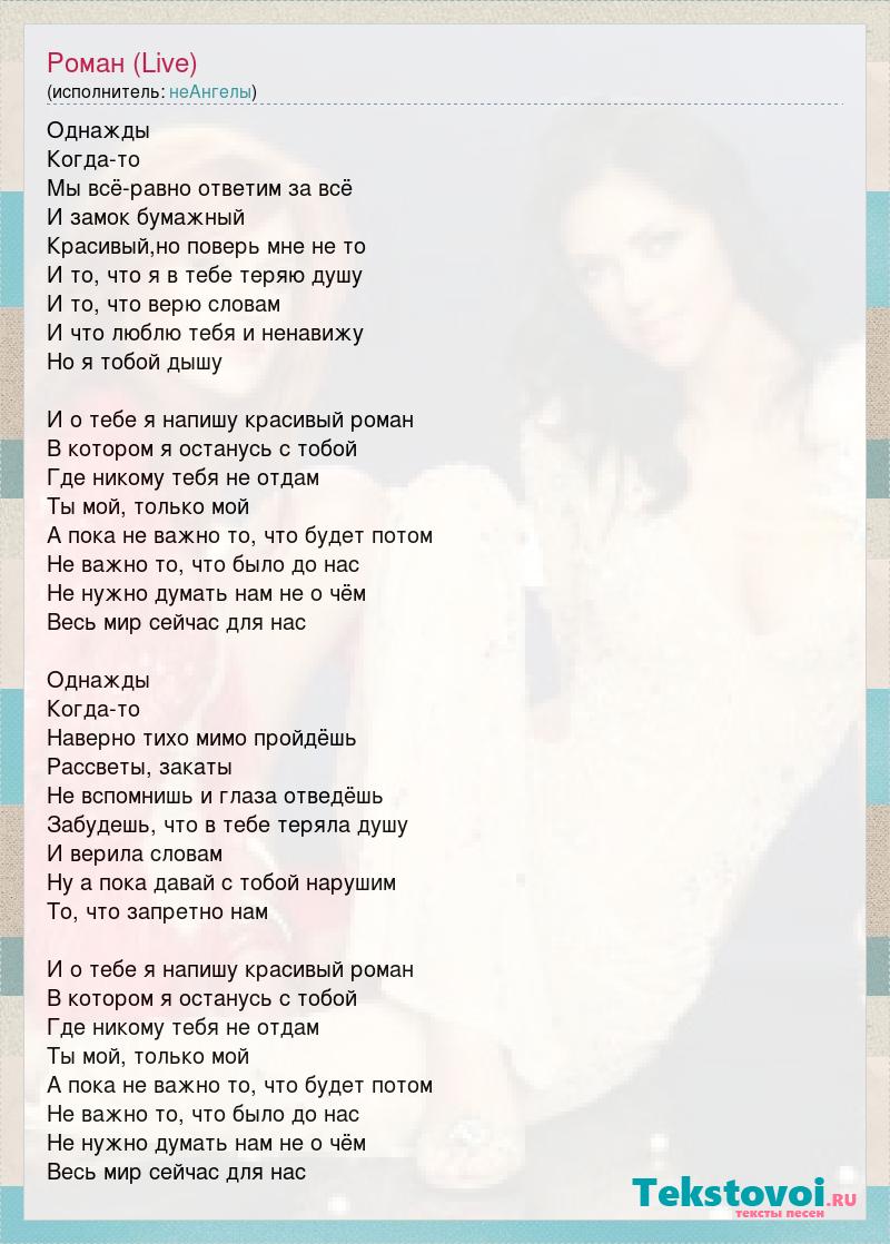 Однажды Когда-то Мы всё-равно ответим за всё И замок бумажный Красивый,но поверь мне не то И то, что я в тебе теряю душу И то, что верю словам И что люблю тебя и ненавижу Но я тобой дышу И о тебе я напишу красивый роман В котором я останусь с тобой Где никому тебя не отдам Ты мой, только мой А пока не важно то, что будет потом Не важно то, что было до нас Не нужно думать нам не о чём Весь мир сейчас для нас Однажды Когда-то Наверно тихо мимо пройдёшь Рассветы, закаты Не вспомнишь и глаза отведёшь Забудешь, что в тебе теряла душу И верила словам Ну а пока давай с тобой нарушим То, что запретно нам И о тебе я напишу красивый роман В котором я останусь с тобой Где никому тебя не отдам Ты мой, только мой А пока не важно то, что будет потом Не важно то, что было до нас Не нужно думать нам не о чём Весь мир сейчас для нас