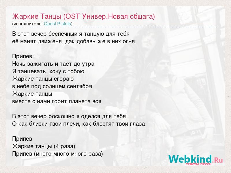 В этот вечер беспечный я танцую для тебя её манят движеня, дак добавь же в них огня Припев: Ночь зажигать и тает до утра Я танцевать, хочу с тобою Жаркие танцы сгораю в небе под солнцем сентября Жаркие танцы вместе с нами горит планета вся В этот вечер роскошно я оделся для тебя О как близки твои плечи, как блестят твои глаза Припев Жаpкие танцы (4 раза) Припев (много-много-много раза)