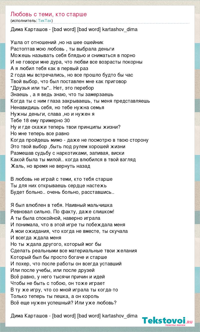 Дима Карташов - [bad word] [bad word] kartashov_dima Ушла от отношений ,но на шее ошейник Растоптав мою любовь , ты выбрала деньги Можешь называть себя блядью и сниматься в порно И не говори мне дура, что любви все возрасты покорны А я любил тебя как в первый раз 2 года мы встречались, но все прошло будто бы час Твой выбор, что был поставлен мне как приговор "Друзья или ты".. Нет, это перебор Знаешь , а я ведь знаю, что ты замерзаешь Когда ты с ним глаза закрываешь, ты меня представляешь Ненавидишь себя, но тебе нужна семья Нужны деньги, слава ,но и нужен я Тебе 18 ему примерно 30 Ну и где скажи теперь твои принципы жизни? Но мне теперь все равно Когда пройдешь мимо - даже не посмотрю в твою сторону Это твой выбор ,быть под рулем хорошей жизни Размешав судьбу с наркотиками, запивая, виски Какой была ты милой.. когда влюбился в твой взгляд Жаль, но время не вернуть назад В любовь не играй с теми, кто тебя старше Ты для них открываешь сердце настежь Будет больно.. очень больно, расставшись.. Я был влюблен в тебя. Наивный мальчишка Ревновал сильно. По факту, даже слишком! А ты была спокойной, наверно играла И понимала, что в этой игре ты побеждала меня А мои ожидания, что когда не вместе, ты скучала И всегда ждала меня Но ты ждала другого, который мог бы Сделать реальными все материальные твои желания Который был бы просто богаче и старше И похер, что после работы он всегда уставший Или после учебы, или после друзей Всё равно, у него тысячи причин и идей Чтобы не быть с тобою, он тоже играет В ту же игру, что со мной играла ты когда-то Только теперь ты пешка, а он король Всё еще нужен успешный? Или уже любовь? Дима Карташов - [bad word] [bad word] kartashov_dima