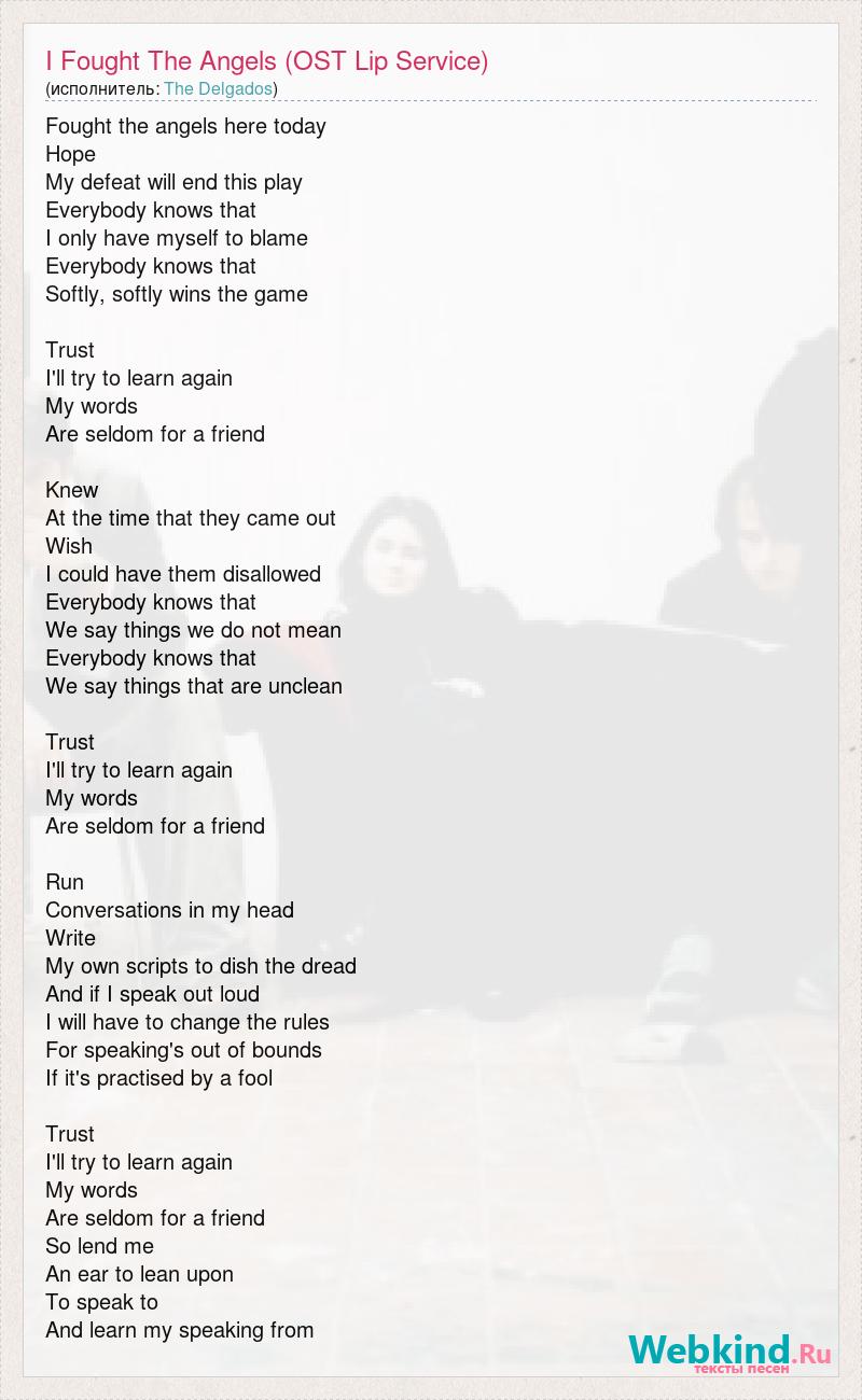Fought the angels here today Hope My defeat will end this play Everybody knows that I only have myself to blame Everybody knows that Softly, softly wins the game Trust I'll try to learn again My words Are seldom for a friend Knew At the time that they came out Wish I could have them disallowed Everybody knows that We say things we do not mean Everybody knows that We say things that are unclean Trust I'll try to learn again My words Are seldom for a friend Run Conversations in my head Write My own scripts to dish the dread And if I speak out loud I will have to change the rules For speaking's out of bounds If it's practised by a fool Trust I'll try to learn again My words Are seldom for a friend So lend me An ear to lean upon To speak to And learn my speaking from