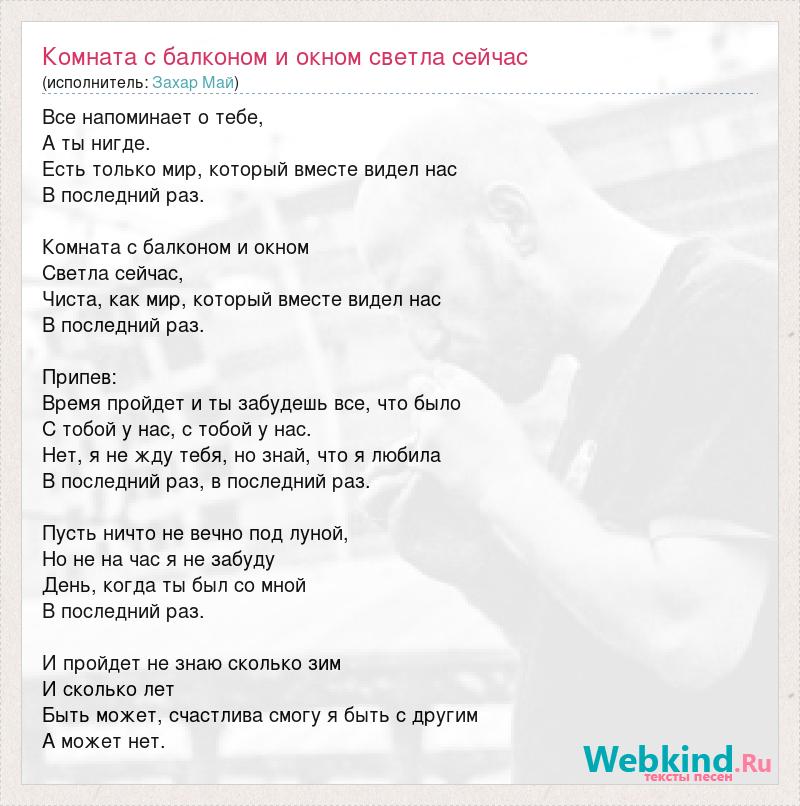 Все напоминает о тебе, А ты нигде. Есть только мир, который вместе видел нас В последний раз. Комната с балконом и окном Светла сейчас, Чиста, как мир, который вместе видел нас В последний раз. Припев: Время пройдет и ты забудешь все, что было С тобой у нас, с тобой у нас. Нет, я не жду тебя, но знай, что я любила В последний раз, в последний раз. Пусть ничто не вечно под луной, Но не на час я не забуду День, когда ты был со мной В последний раз. И пройдет не знаю сколько зим И сколько лет Быть может, счастлива смогу я быть с другим А может нет.