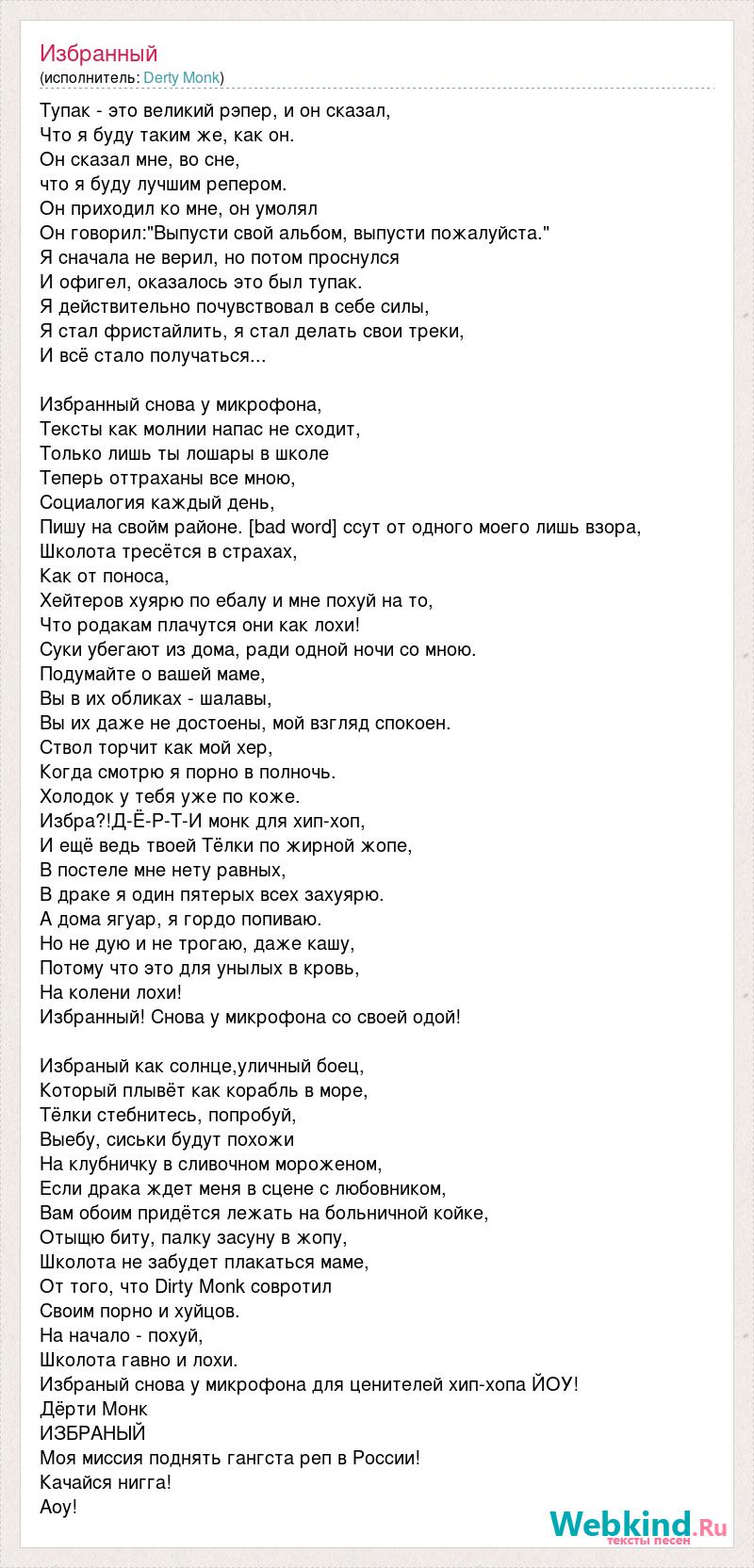 Тупак - это великий рэпер, и он сказал, Что я буду таким же, как он. Он сказал мне, во сне, что я буду лучшим репером. Он приходил ко мне, он умолял Он говорил:"Выпусти свой альбом, выпусти пожалуйста." Я сначала не верил, но потом проснулся И офигел, оказалось это был тупак. Я действительно почувствовал в себе силы, Я стал фристайлить, я стал делать свои треки, И всё стало получаться... Избранный снова у микрофона, Тексты как молнии напас не сходит, Только лишь ты лошары в школе Теперь оттраханы все мною, Социалогия каждый день, Пишу на свойм районе. [bad word] ссут от одного моего лишь взора, Школота тресётся в страхах, Как от поноса, Хейтеров хуярю по ебалу и мне похуй на то, Что родакам плачутся они как лохи! Суки убегают из дома, ради одной ночи со мною. Подумайте о вашей маме, Вы в их обликах - шалавы, Вы их даже не достоены, мой взгляд спокоен. Ствол торчит как мой хер, Когда смотрю я порно в полночь. Холодок у тебя уже по коже. Избра?!Д-Ё-Р-Т-И монк для хип-хоп, И ещё ведь твоей Тёлки по жирной жопе, В постеле мне нету равных, В драке я один пятерых всех захуярю. А дома ягуар, я гордо попиваю. Но не дую и не трогаю, даже кашу, Потому что это для унылых в кровь, На колени лохи! Избранный! Снова у микрофона со своей одой! Избраный как солнце,уличный боец, Который плывёт как корабль в море, Тёлки стебнитесь, попробуй, Выебу, сиськи будут похожи На клубничку в сливочном мороженом, Если драка ждет меня в сцене с любовником, Вам обоим придётся лежать на больничной койке, Отыщю биту, палку засуну в жопу, Школота не забудет плакаться маме, От того, что Dirty Monk совротил Своим порно и хуйцов. На начало - похуй, Школота гавно и лохи. Избраный снова у микрофона для ценителей хип-хопа ЙОУ! Дёрти Монк ИЗБРАНЫЙ Моя миссия поднять гангста реп в России! Качайся нигга! Аоу!