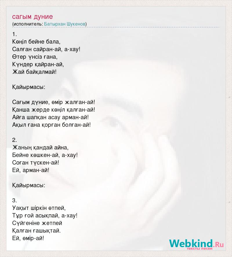 1. Көңіл бейне бала, Салған сайран-ай, а-хау! Өтер үнсіз ғана, Күндер қайран-ай, Жай байқалмай! Қайырмасы: Сағым дүние, өмір жалған-ай! Қанша жерде көңіл қалған-ай! Айға шапқан асау арман-ай! Ақыл ғана қорған болған-ай! 2. Жаның қандай айна, Бейне көшкен-ай, а-хау! Соған түскен-ай! Ей, арман-ай! Қайырмасы: 3. Уақыт шіркін өтпей, Тұр ғой асықпай, а-хау! Сүйгеніне жетпей Қалған ғашықтай. Ей, өмір-ай!