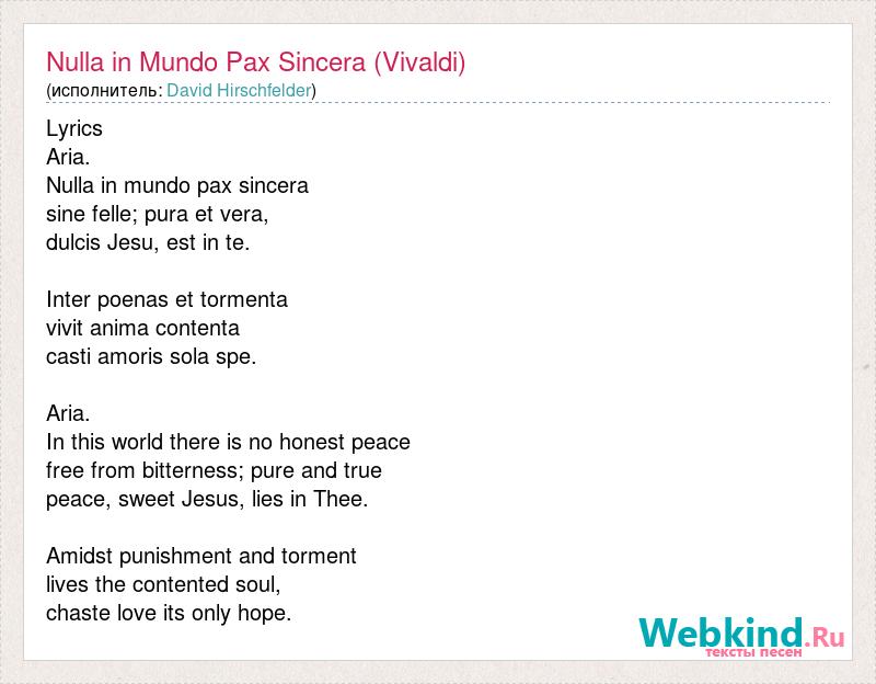 Lyrics Aria. Nulla in mundo pax sincera sine felle; pura et vera, dulcis Jesu, est in te. Inter poenas et tormenta vivit anima contenta casti amoris sola spe. Aria. In this world there is no honest peace free from bitterness; pure and true peace, sweet Jesus, lies in Thee. Amidst punishment and torment lives the contented soul, chaste love its only hope.