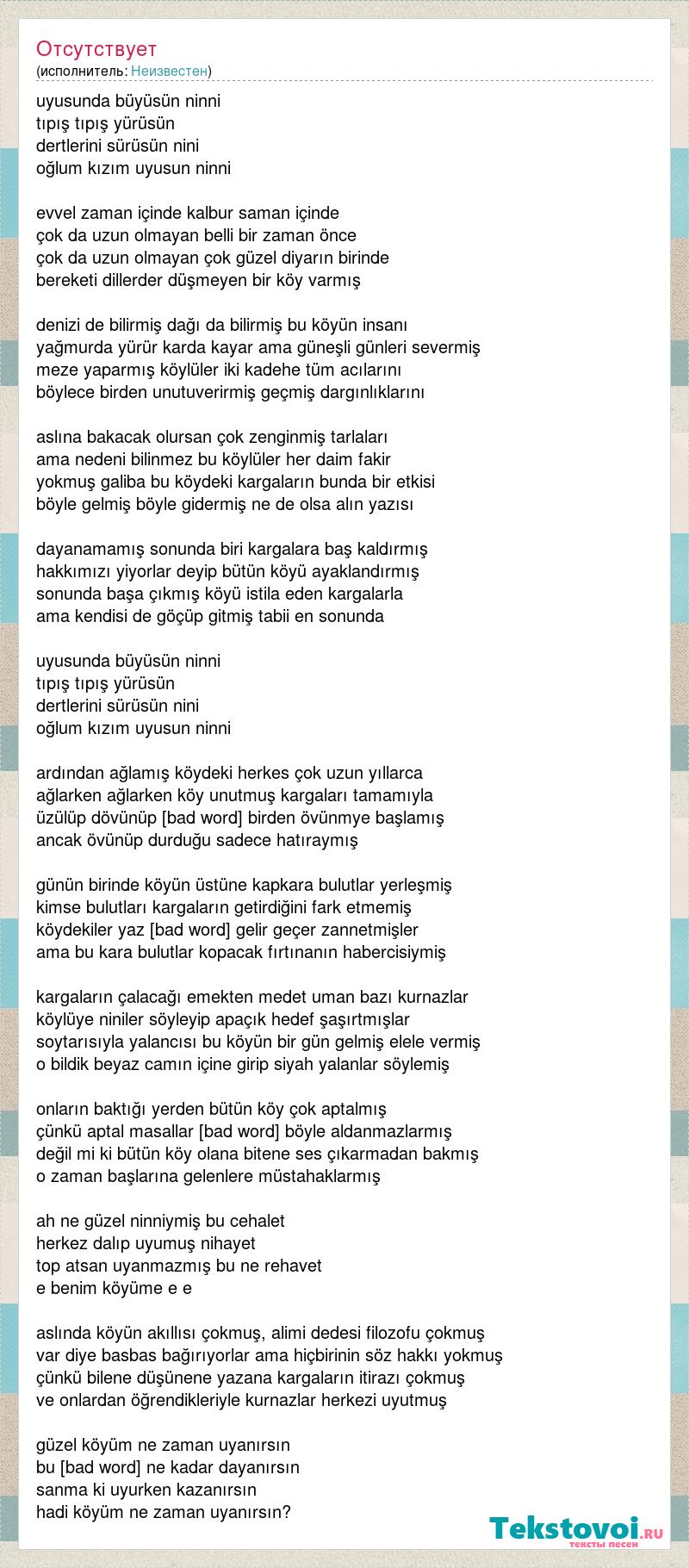 uyusunda büyüsün ninni tıpış tıpış yürüsün dertlerini sürüsün nini oğlum kızım uyusun ninni evvel zaman içinde kalbur saman içinde çok da uzun olmayan belli bir zaman önce çok da uzun olmayan çok güzel diyarın birinde bereketi dillerder düşmeyen bir köy varmış denizi de bilirmiş dağı da bilirmiş bu köyün insanı yağmurda yürür karda kayar ama güneşli günleri severmiş meze yaparmış köylüler iki kadehe tüm acılarını böylece birden unutuverirmiş geçmiş dargınlıklarını aslına bakacak olursan çok zenginmiş tarlaları ama nedeni bilinmez bu köylüler her daim fakir yokmuş galiba bu köydeki kargaların bunda bir etkisi böyle gelmiş böyle gidermiş ne de olsa alın yazısı dayanamamış sonunda biri kargalara baş kaldırmış hakkımızı yiyorlar deyip bütün köyü ayaklandırmış sonunda başa çıkmış köyü istila eden kargalarla ama kendisi de göçüp gitmiş tabii en sonunda uyusunda büyüsün ninni tıpış tıpış yürüsün dertlerini sürüsün nini oğlum kızım uyusun ninni ardından ağlamış köydeki herkes çok uzun yıllarca ağlarken ağlarken köy unutmuş kargaları tamamıyla üzülüp dövünüp dururken birden övünmye başlamış ancak övünüp durduğu sadece hatıraymış günün birinde köyün üstüne kapkara bulutlar yerleşmiş kimse bulutları kargaların getirdiğini fark etmemiş köydekiler yaz yağmurudur gelir geçer zannetmişler ama bu kara bulutlar kopacak fırtınanın habercisiymiş kargaların çalacağı emekten medet uman bazı kurnazlar köylüye niniler söyleyip apaçık hedef şaşırtmışlar soytarısıyla yalancısı bu köyün bir gün gelmiş elele vermiş o bildik beyaz camın içine girip siyah yalanlar söylemiş onların baktığı yerden bütün köy çok aptalmış çünkü aptal masallar [bad word] böyle aldanmazlarmış değil mi ki bütün köy olana bitene ses çıkarmadan bakmış o zaman başlarına gelenlere müstahaklarmış ah ne güzel ninniymiş bu cehalet herkez dalıp uyumuş nihayet top atsan uyanmazmış bu ne rehavet e benim köyüme e e aslında köyün akıllısı çokmuş, alimi dedesi filozofu çokmuş var diye basbas bağırıyorlar ama hiçbirinin söz hakkı yokmuş çünkü bilene düşünene yazana kargaların itirazı çokmuş ve onlardan öğrendikleriyle kurnazlar herkezi uyutmuş güzel köyüm ne zaman uyanırsın bu duruma ne kadar dayanırsın sanma ki uyurken kazanırsın hadi köyüm ne zaman uyanırsın?