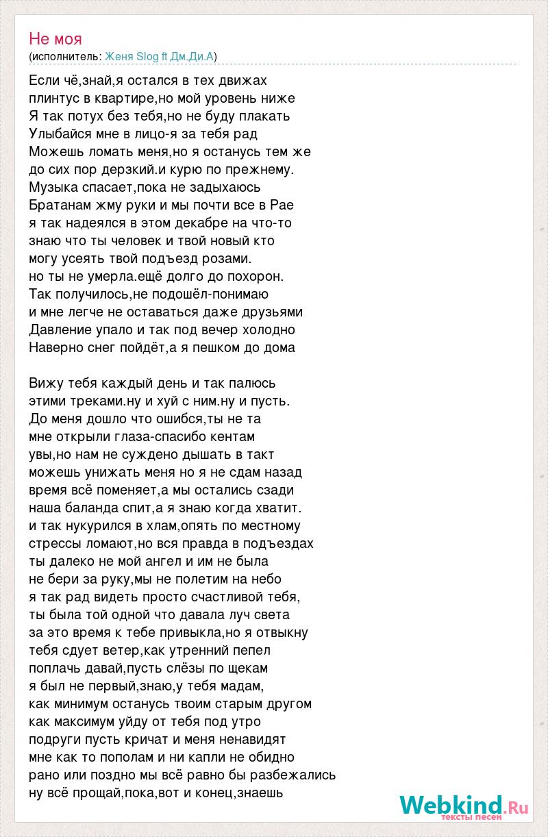 Если чё,знай,я остался в тех движах плинтус в квартире,но мой уровень ниже Я так потух без тебя,но не буду плакать Улыбайся мне в лицо-я за тебя рад Можешь ломать меня,но я останусь тем же до сих пор дерзкий.и курю по прежнему. Музыка спасает,пока не задыхаюсь Братанам жму руки и мы почти все в Рае я так надеялся в этом декабре на что-то знаю что ты человек и твой новый кто могу усеять твой подъезд розами. но ты не умерла.ещё долго до похорон. Так получилось,не подошёл-понимаю и мне легче не оставаться даже друзьями Давление упало и так под вечер холодно Наверно снег пойдёт,а я пешком до дома Вижу тебя каждый день и так палюсь этими треками.ну и хуй с ним.ну и пусть. До меня дошло что ошибся,ты не та мне открыли глаза-спасибо кентам увы,но нам не суждено дышать в такт можешь унижать меня но я не сдам назад время всё поменяет,а мы остались сзади наша баланда спит,а я знаю когда хватит. и так нукурился в хлам,опять по местному стрессы ломают,но вся правда в подъездах ты далеко не мой ангел и им не была не бери за руку,мы не полетим на небо я так рад видеть просто счастливой тебя, ты была той одной что давала луч света за это время к тебе привыкла,но я отвыкну тебя сдует ветер,как утренний пепел поплачь давай,пусть слёзы по щекам я был не первый,знаю,у тебя мадам, как минимум останусь твоим старым другом как максимум уйду от тебя под утро подруги пусть кричат и меня ненавидят мне как то пополам и ни капли не обидно рано или поздно мы всё равно бы разбежались ну всё прощай,пока,вот и конец,знаешь