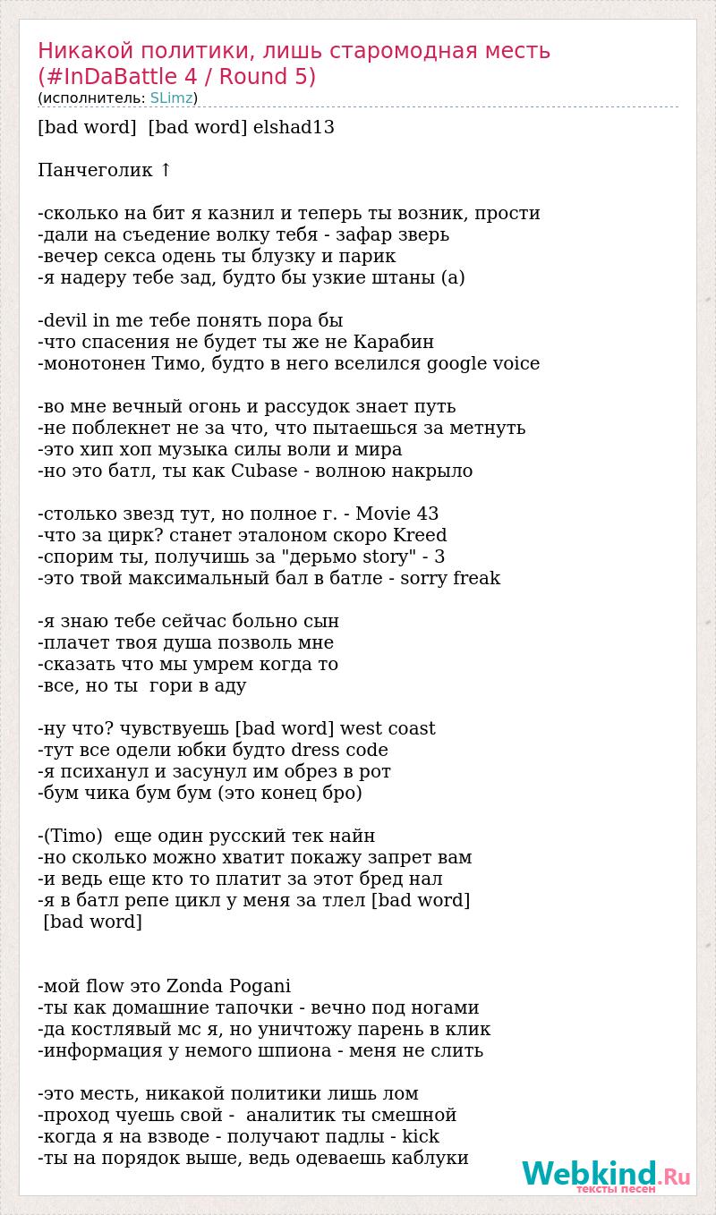 [bad word] [bad word] elshad13 Панчеголик ↑ -сколько на бит я казнил и теперь ты возник, прости -дали на съедение волку тебя - зафар зверь -вечер секса одень ты блузку и парик -я надеру тебе зад, будто бы узкие штаны (а) -devil in me тебе понять пора бы -что спасения не будет ты же не Карабин -монотонен Тимо, будто в него вселился google voice -во мне вечный огонь и рассудок знает путь -не поблекнет не за что, что пытаешься за метнуть -это хип хоп музыка силы воли и мира -но это батл, ты как Cubase - волною накрыло -столько звезд тут, но полное г. - Movie 43 -что за цирк? станет эталоном скоро Kreed -спорим ты, получишь за "дерьмо story" - 3 -это твой максимальный бал в батле - sorry freak -я знаю тебе сейчас больно сын -плачет твоя душа позволь мне -сказать что мы умрем когда то -все, но ты гори в аду -ну что? чувствуешь [bad word] west coast -тут все одели юбки будто dress code -я психанул и засунул им обрез в рот -бум чика бум бум (это конец бро) -(Timo) еще один русский тек найн -но сколько можно хватит покажу запрет вам -и ведь еще кто то платит за этот бред нал -я в батл репе цикл у меня за тлел [bad word] [bad word] -мой flow это Zonda Pogani -ты как домашние тапочки - вечно под ногами -да костлявый мс я, но уничтожу парень в клик -информация у немого шпиона - меня не слить -это месть, никакой политики лишь лом -проход чуешь свой - аналитик ты смешной -когда я на взводе - получают падлы - kick -ты на порядок выше, ведь одеваешь каблуки