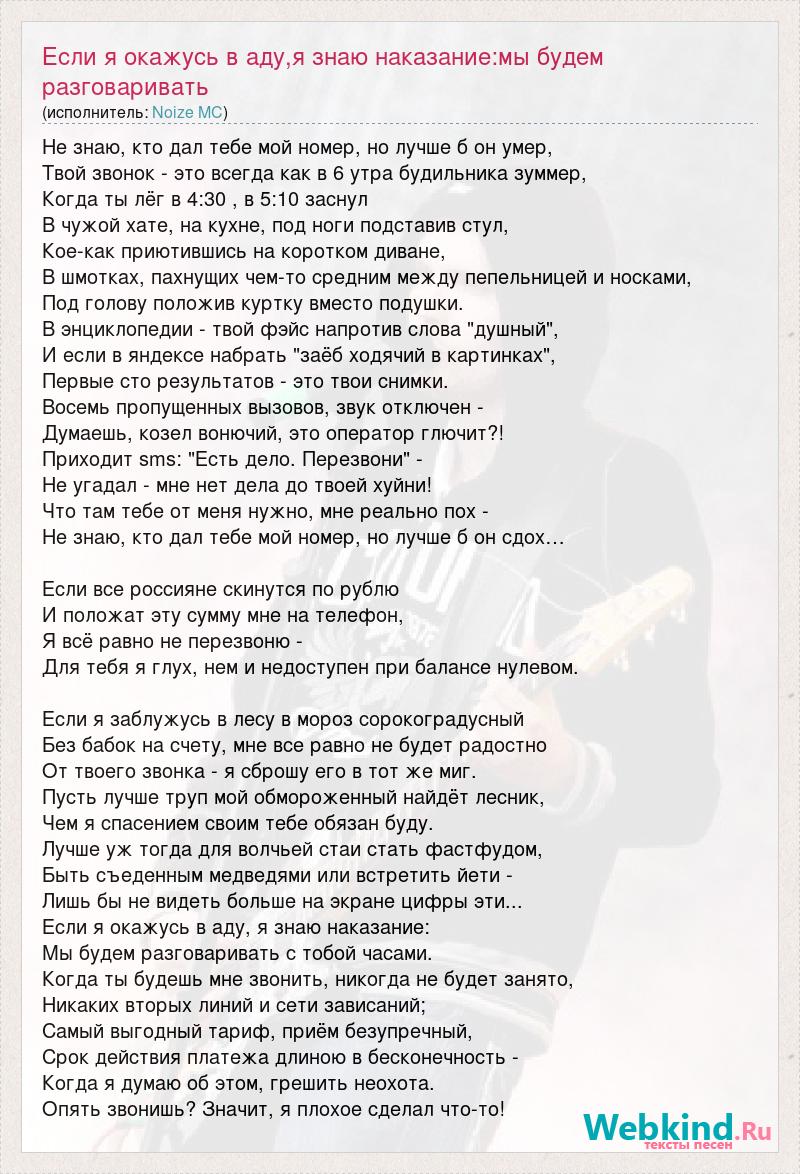 Не знаю, кто дал тебе мой номер, но лучше б он умер, Твой звонок - это всегда как в 6 утра будильника зуммер, Когда ты лёг в 4:30 , в 5:10 заснул В чужой хате, на кухне, под ноги подставив стул, Кое-как приютившись на коротком диване, В шмотках, пахнущих чем-то средним между пепельницей и носками, Под голову положив куртку вместо подушки. В энциклопедии - твой фэйс напротив слова "душный", И если в яндексе набрать "заёб ходячий в картинках", Первые сто результатов - это твои снимки. Восемь пропущенных вызовов, звук отключен - Думаешь, козел вонючий, это оператор глючит?! Приходит sms: "Есть дело. Перезвони" - Не угадал - мне нет дела до твоей хуйни! Что там тебе от меня нужно, мне реально пох - Не знаю, кто дал тебе мой номер, но лучше б он сдох… Если все россияне скинутся по рублю И положат эту сумму мне на телефон, Я всё равно не перезвоню - Для тебя я глух, нем и недоступен при балансе нулевом. Если я заблужусь в лесу в мороз сорокоградусный Без бабок на счету, мне все равно не будет радостно От твоего звонка - я сброшу его в тот же миг. Пусть лучше труп мой обмороженный найдёт лесник, Чем я спасением своим тебе обязан буду. Лучше уж тогда для волчьей стаи стать фастфудом, Быть съеденным медведями или встретить йети - Лишь бы не видеть больше на экране цифры эти... Если я окажусь в аду, я знаю наказание: Мы будем разговаривать с тобой часами. Когда ты будешь мне звонить, никогда не будет занято, Никаких вторых линий и сети зависаний; Самый выгодный тариф, приём безупречный, Срок действия платежа длиною в бесконечность - Когда я думаю об этом, грешить неохота. Опять звонишь? Значит, я плохое сделал что-то!